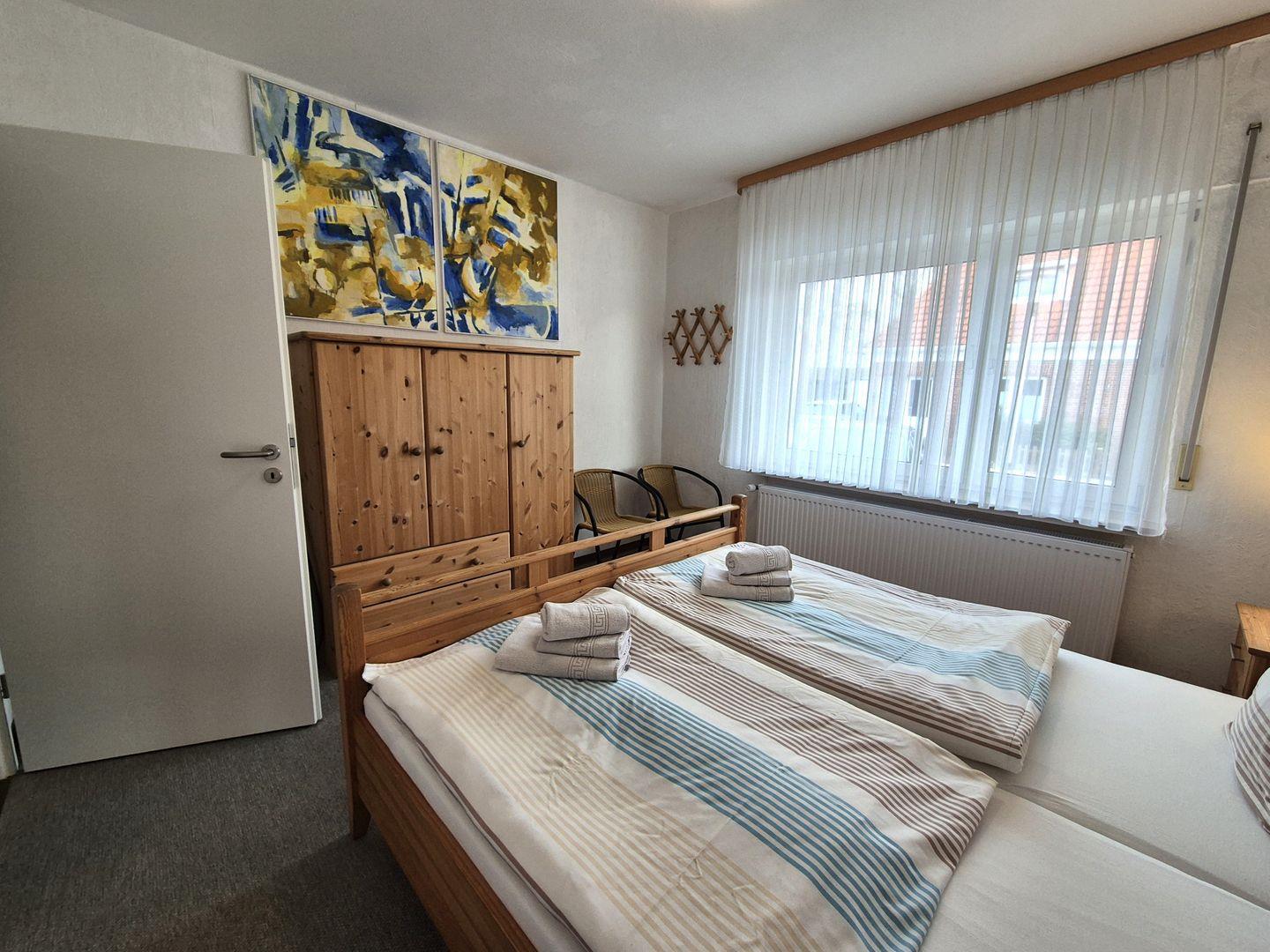 Im separatem Schlafzimmer befindet sich ein Doppelbett und ein Schrank.