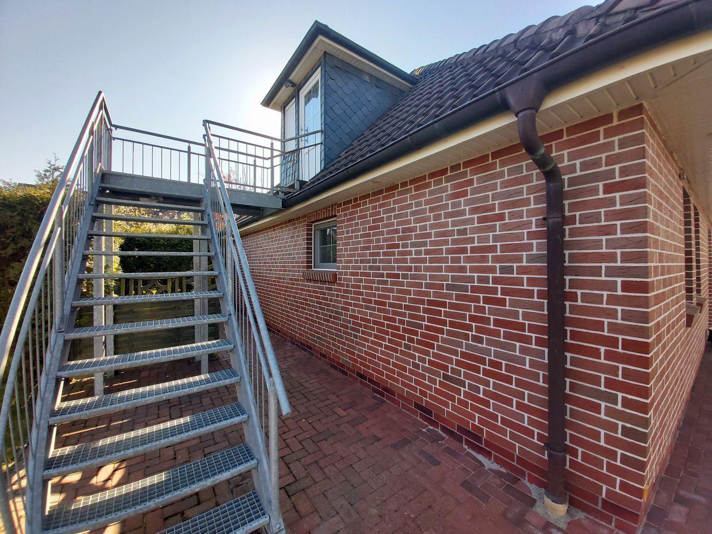 Die OG Wohnung ist über eine separate Außentreppe zu erreichen. Eine gemütliche Küche mit Essplatz und allem was gebraucht wird ist durch einen Raumteiler vom gemütlichen Wohnzimmer getrennt.