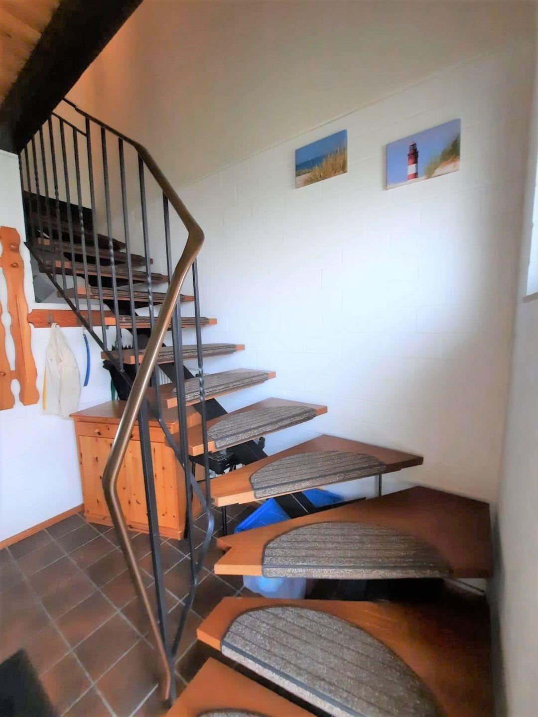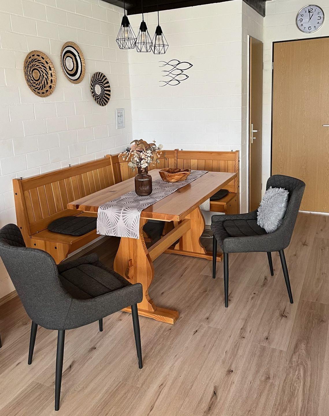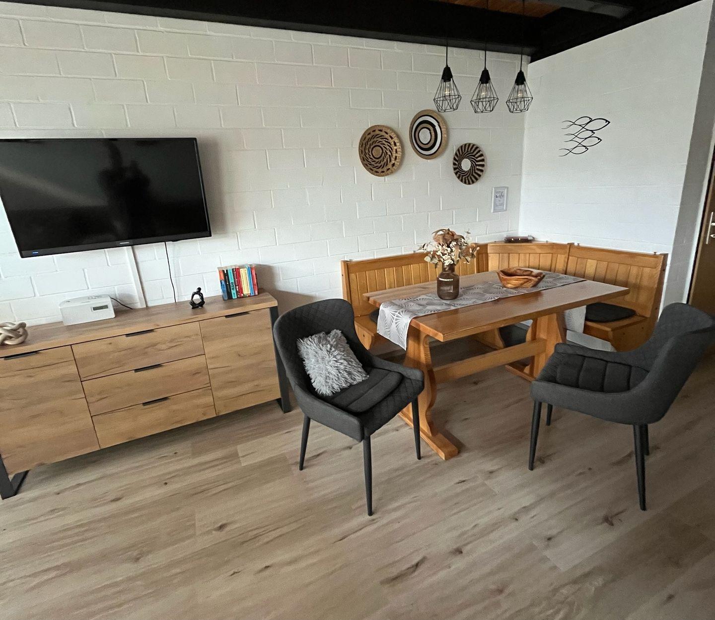 Im Erdgeschoss wartet ein toller Wohn- und Essbereich mit Küche auf Sie. Der Wohnbereich bietet eine Couch, Fernseher. Die gemütliche Essecke mit Eckbank bietet genügend Platz für 4 Personen. In der integrierten Küche mit Kühlschrank inkl. Gefrierfach, Ceranfeld, Backofen, Spülmaschine und weiteren nützlichen Küchenutensilien, bereiten Sie leckere Speisen zu. Das Badezimmer bietet eine Dusche, ein WC, ein Waschbecken mit Spiegel. Ein Eingangsflur mit Garderobe und Abstellraum vervollständigen das Erdgeschoß.