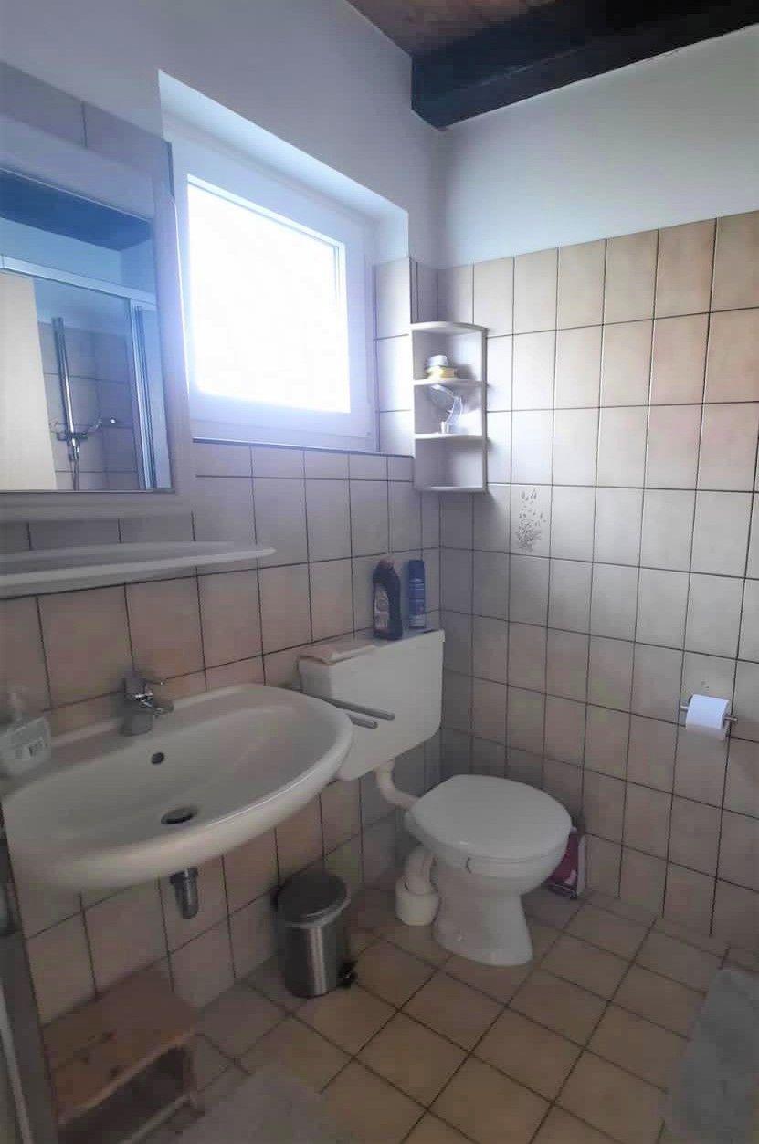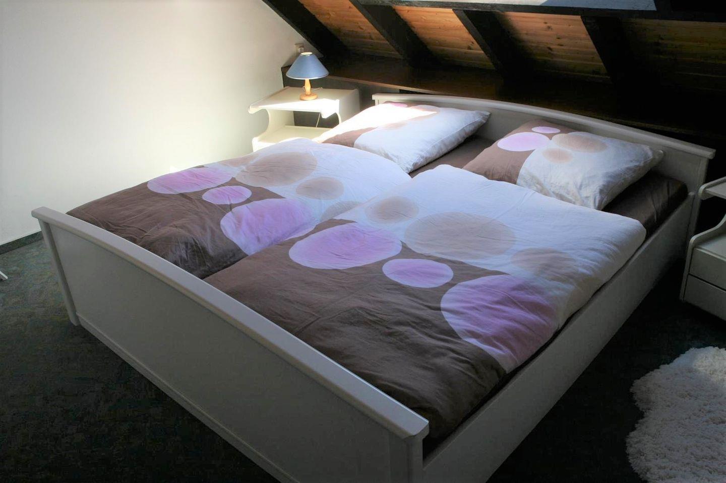Freuen Sie sich im Obergeschoß auf zwei behaglichen Schlafzimmer, von denen eins über ein Doppelbett (1,80m x 2,00m) und eins mit 2 Einzelbetten (0,90m x1,90m u. 0,90m x 2,00m) verfügt. Zusätzlich finden sich hier auch noch ein Gäste-WC.