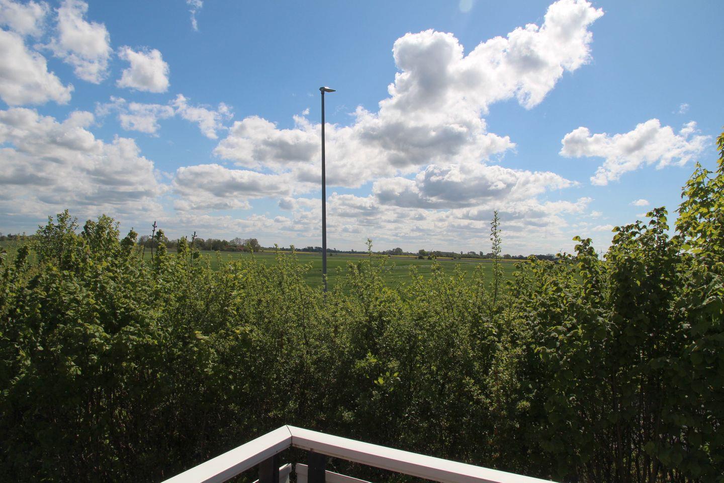 Vom großem, möblierten Balkon haben Sie eine schöne Aussicht über Wiesen und Felder bis zum Horizont.
