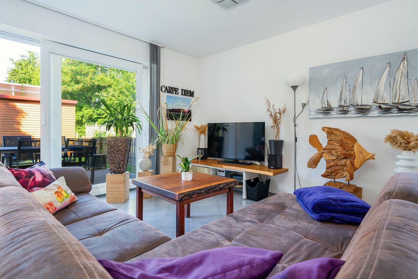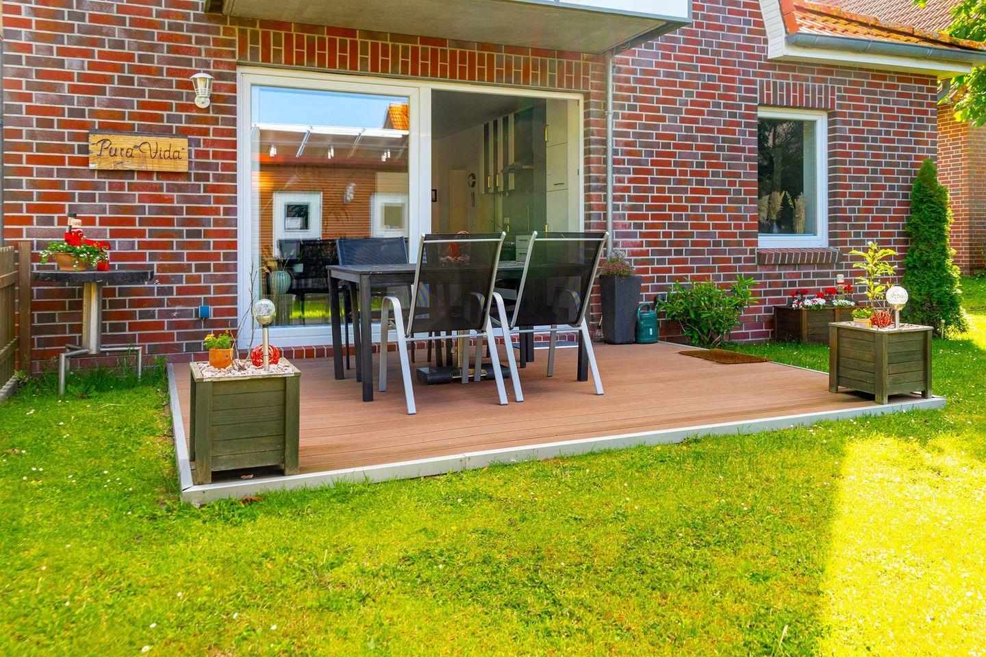Vom Wohn- Essbereich kommen Sie auf die schöne Holz Terrasse aus Bambus und in den schönen kleinen geschützten Garten. Dort gibt es Mobiliar und einen festen Grill für gemütliche Stunden.