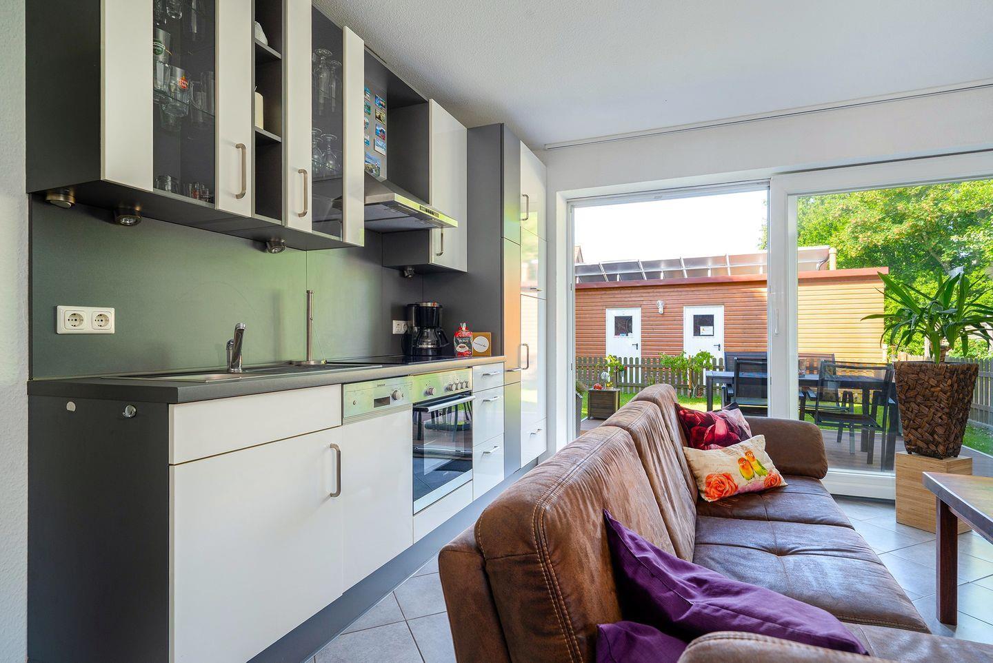 Die Einbauküche ist voll ausgestattet mit Cerankochfeld, Backofen, Mikrowelle, Geschirrspülmaschine, Kühlschrank mit Gefrierfach, Kaffeemaschine, Toaster, Wasserkocher u. v. m.