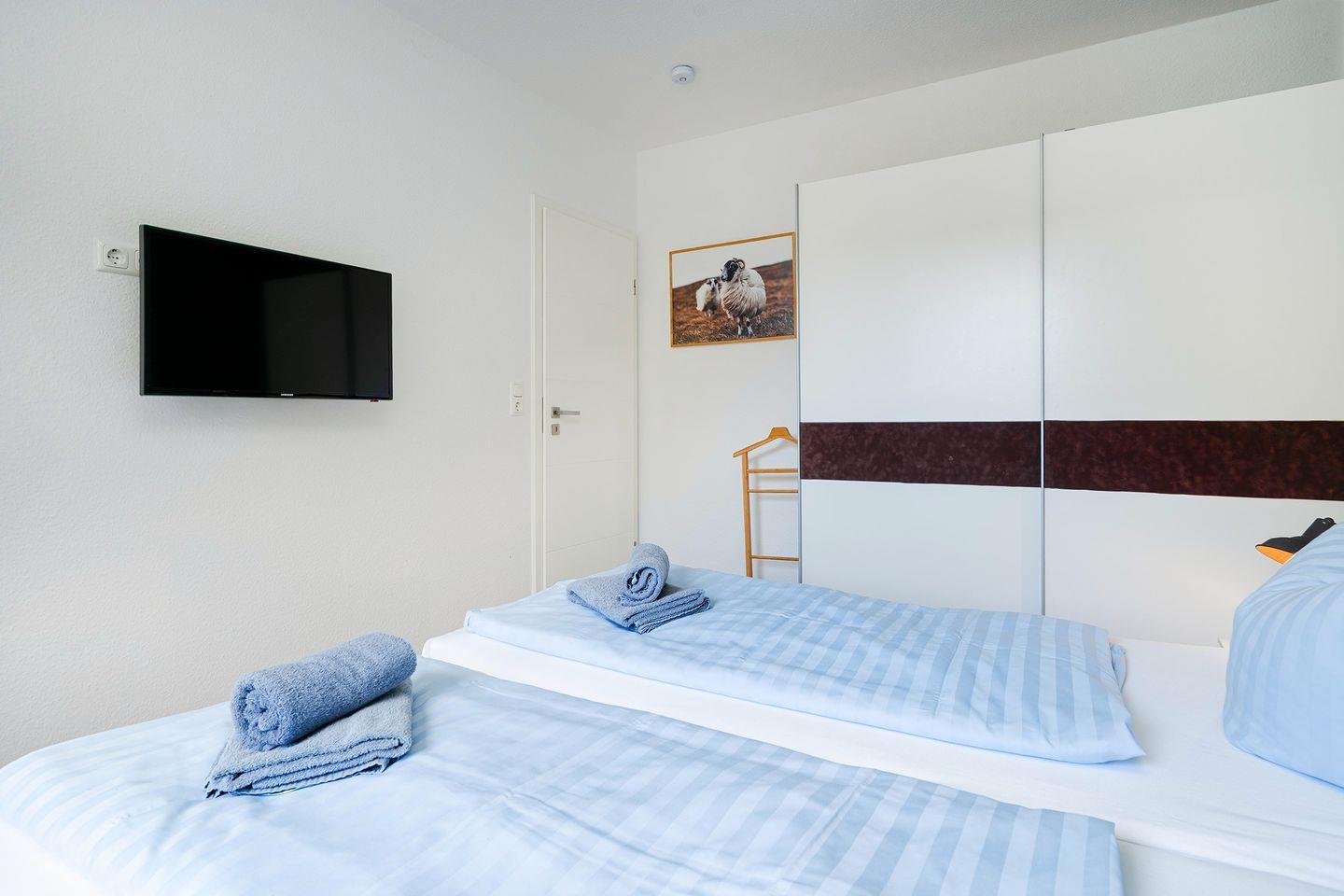 Zwei schöne Schlafräume jeweils mit einem Doppelbett und Sat-TV ausgestattet. Ein Schlafraum ist mit einem großzügigen begehbarem Kleiderschrank ausgestattet.
