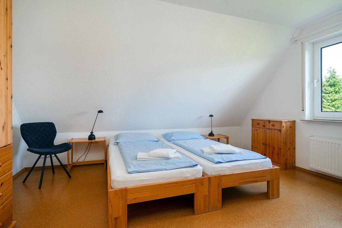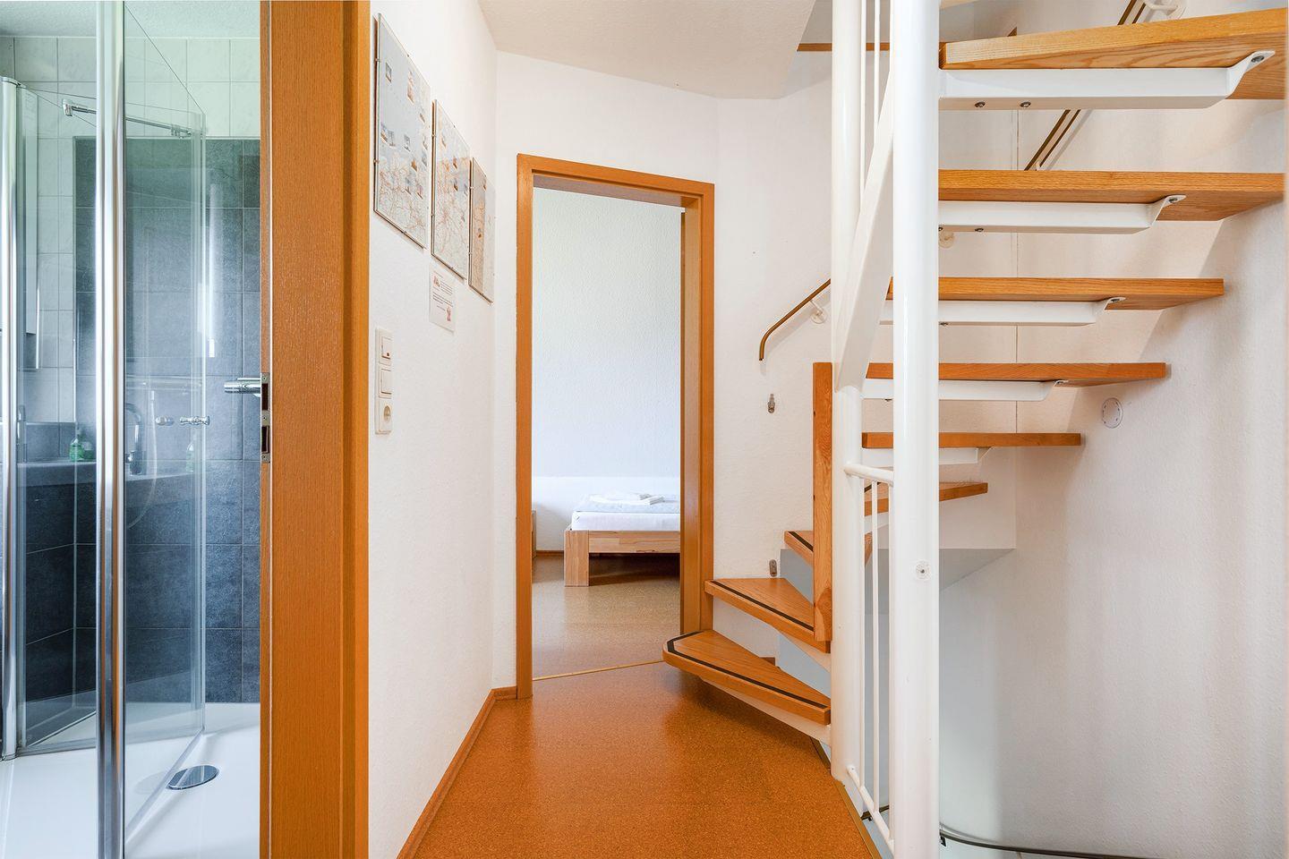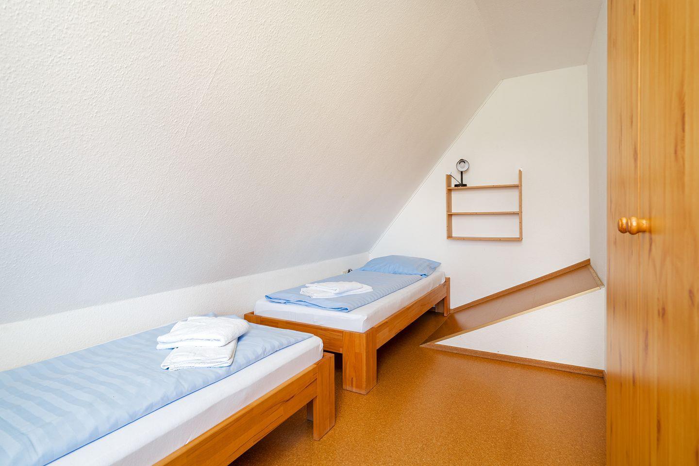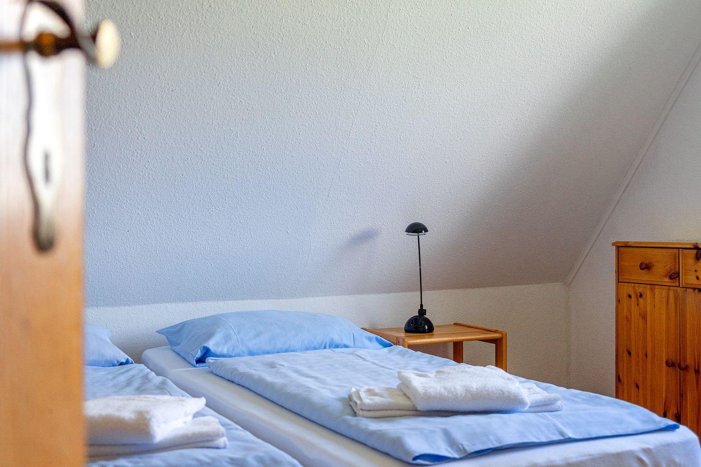 Im Obergeschoß sind 2 Schlafräume (1 * mit Doppelbett, 1 * mit 2 einzelnen Betten, jeweils 90-er Breite), sowie das Dusch-Bad mit WC und beheiztem Handtuchhalter. Ein Kinderreisebett ist vorhanden und passt problemlos in die Schlafräume.