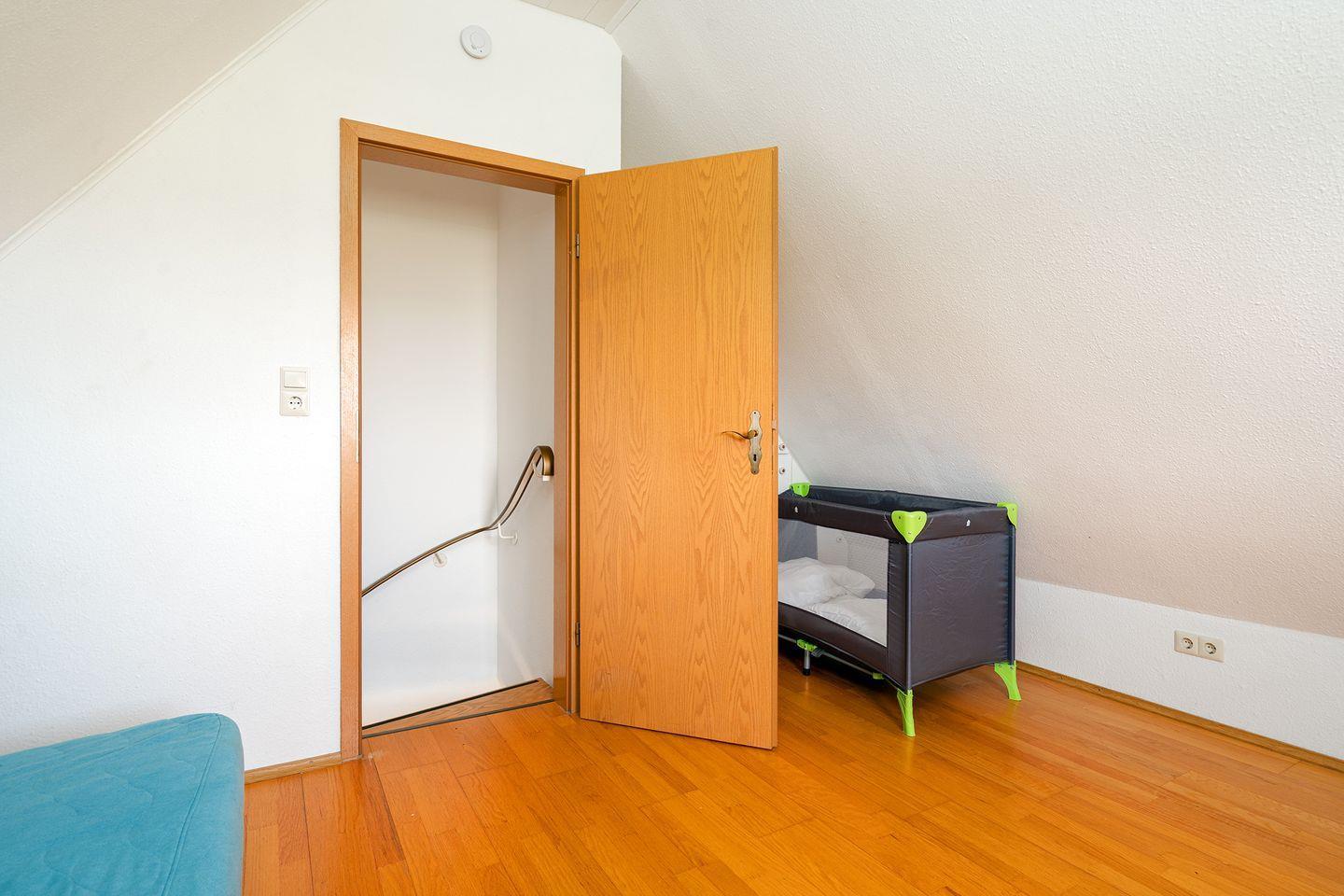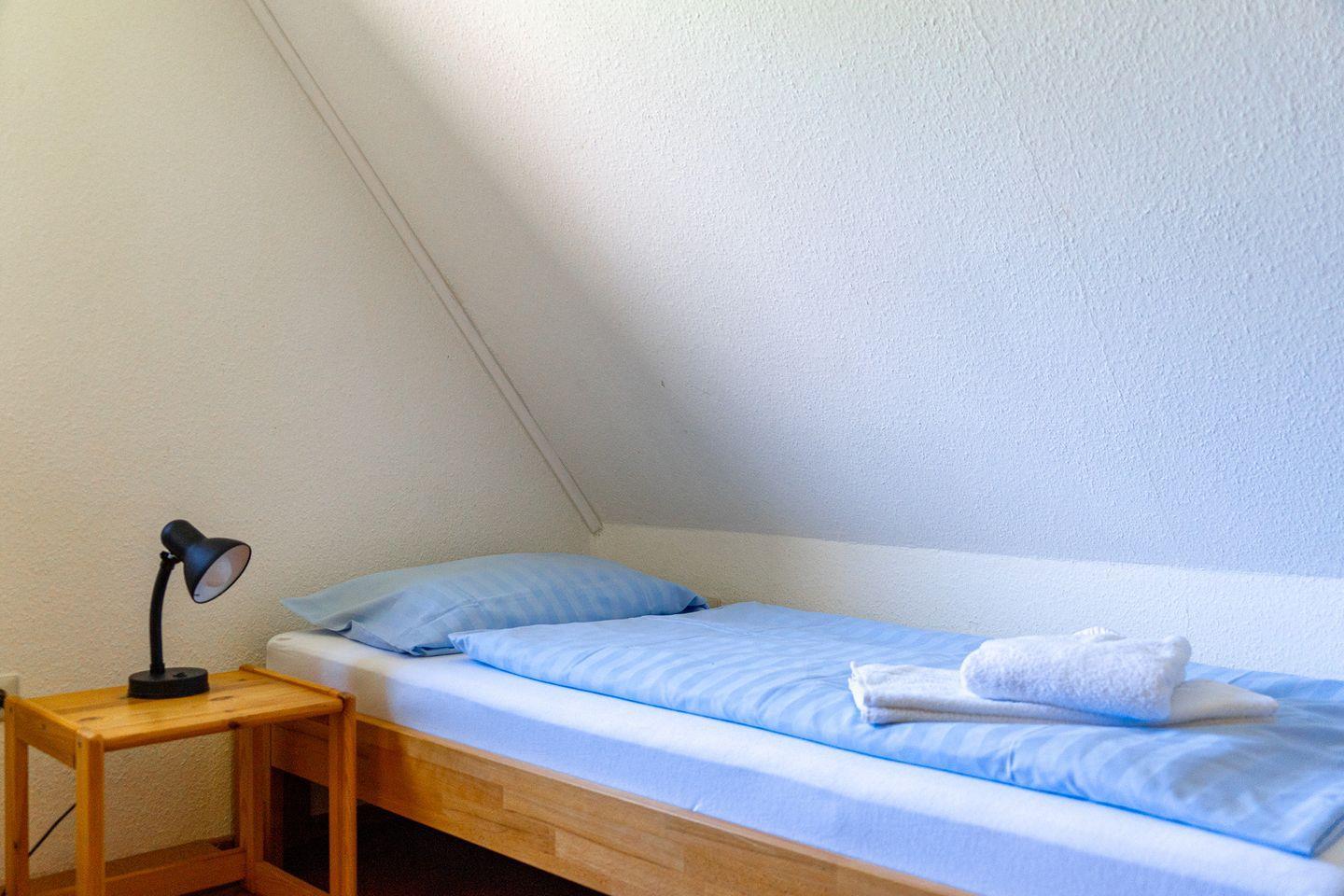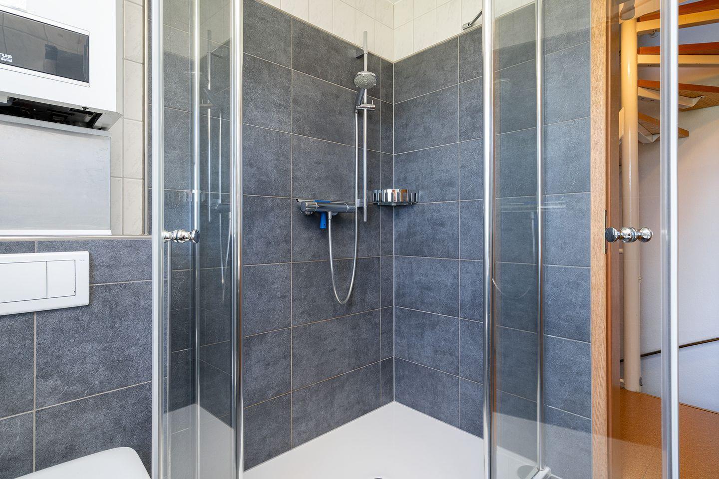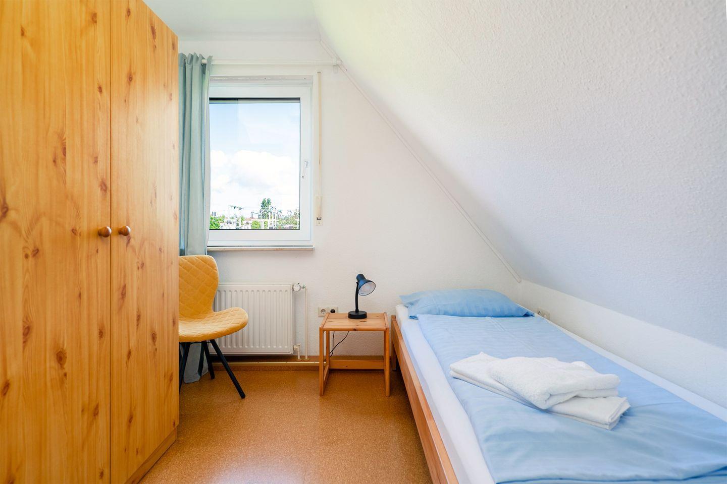 Im Obergeschoß sind 2 Schlafräume (1 * mit Doppelbett, 1 * mit 2 einzelnen Betten, jeweils 90-er Breite), sowie das Dusch-Bad mit WC und beheiztem Handtuchhalter. Ein Kinderreisebett ist vorhanden und passt problemlos in die Schlafräume.