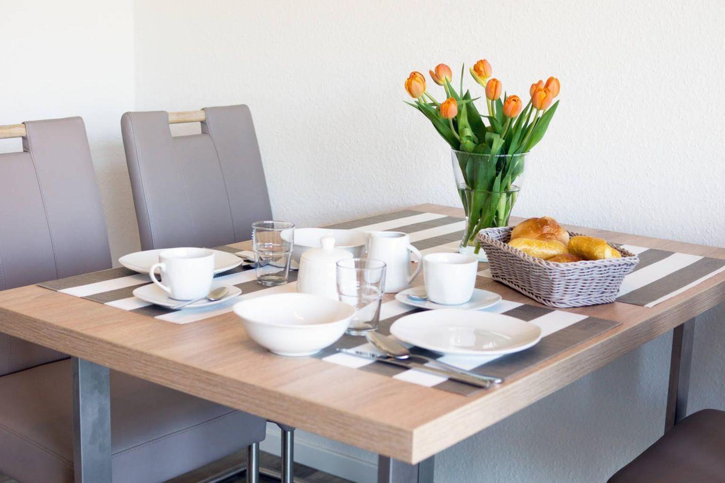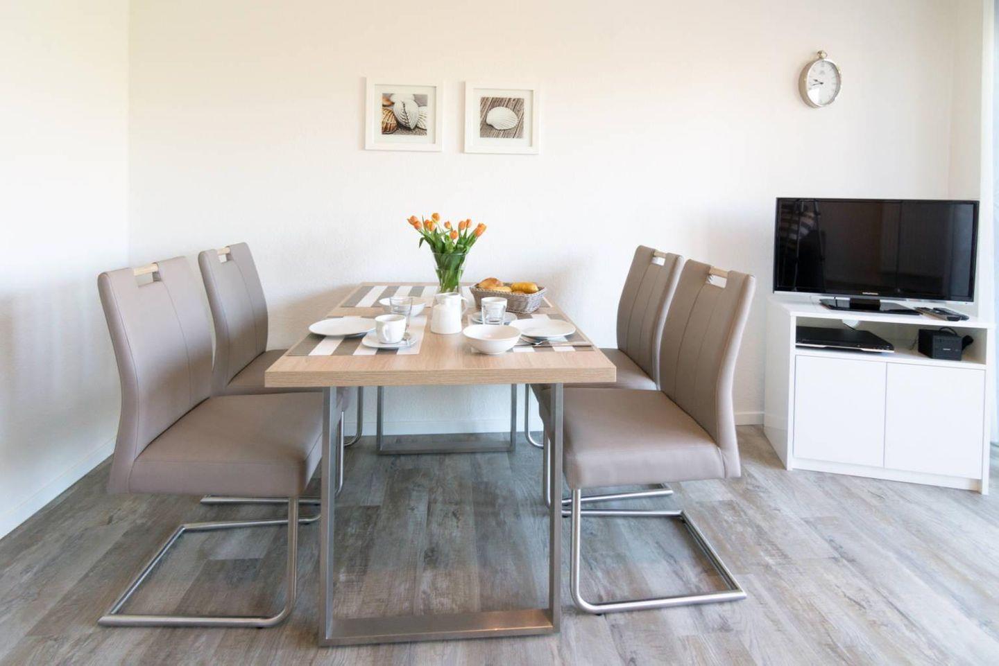 Der helle Wohnbereich verbindet Wohnzimmer und Essplatz zu einem einladenden Treffpunkt. Machen Sie es sich auf Sofa oder Sessel bequem, genießen Sie gemeinsame Mahlzeiten am Esstisch oder entspannen Sie bei einem Filmabend – TV, Radio, DVD-Player sowie WLAN sorgen für Unterhaltung und Komfort.