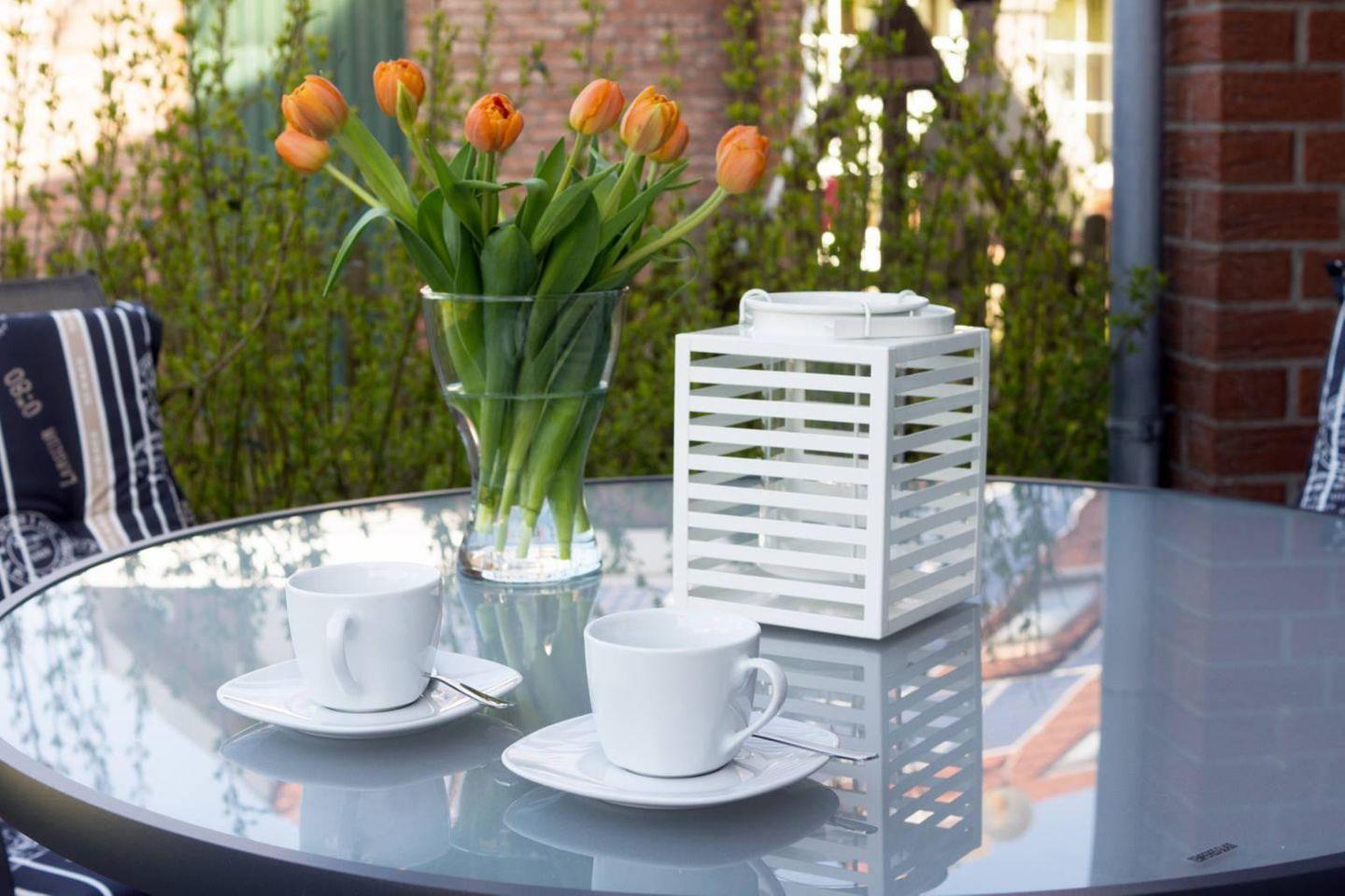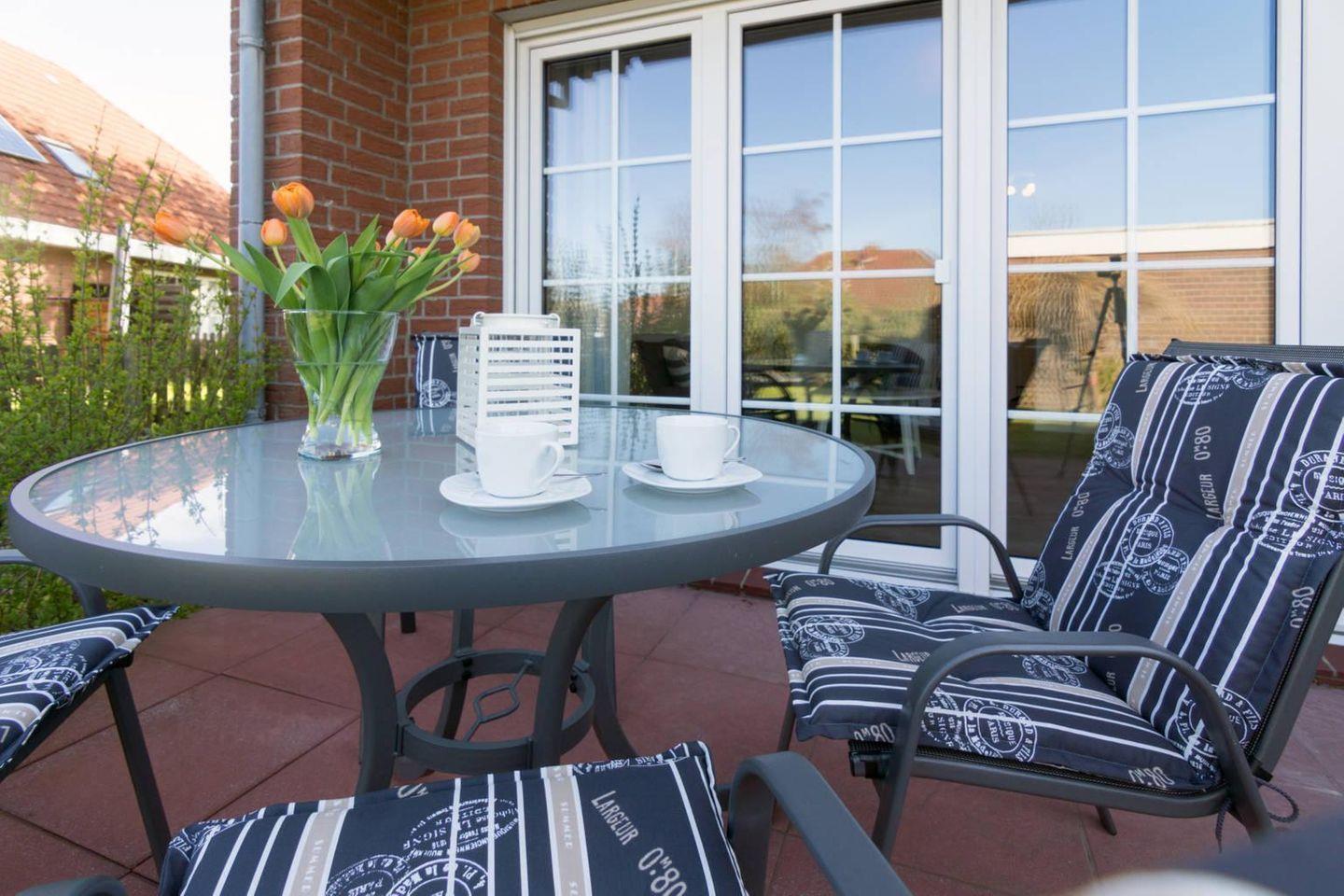 Besonders schön: Der Garten mit Terrasse lädt dazu ein, die frische Nordseeluft zu genießen. Bequeme Gartenmöbel und ein Sonnenschirm machen den Außenbereich zum perfekten Ort für ein Frühstück im Freien oder einen ruhigen Abend bei Sonnenuntergang