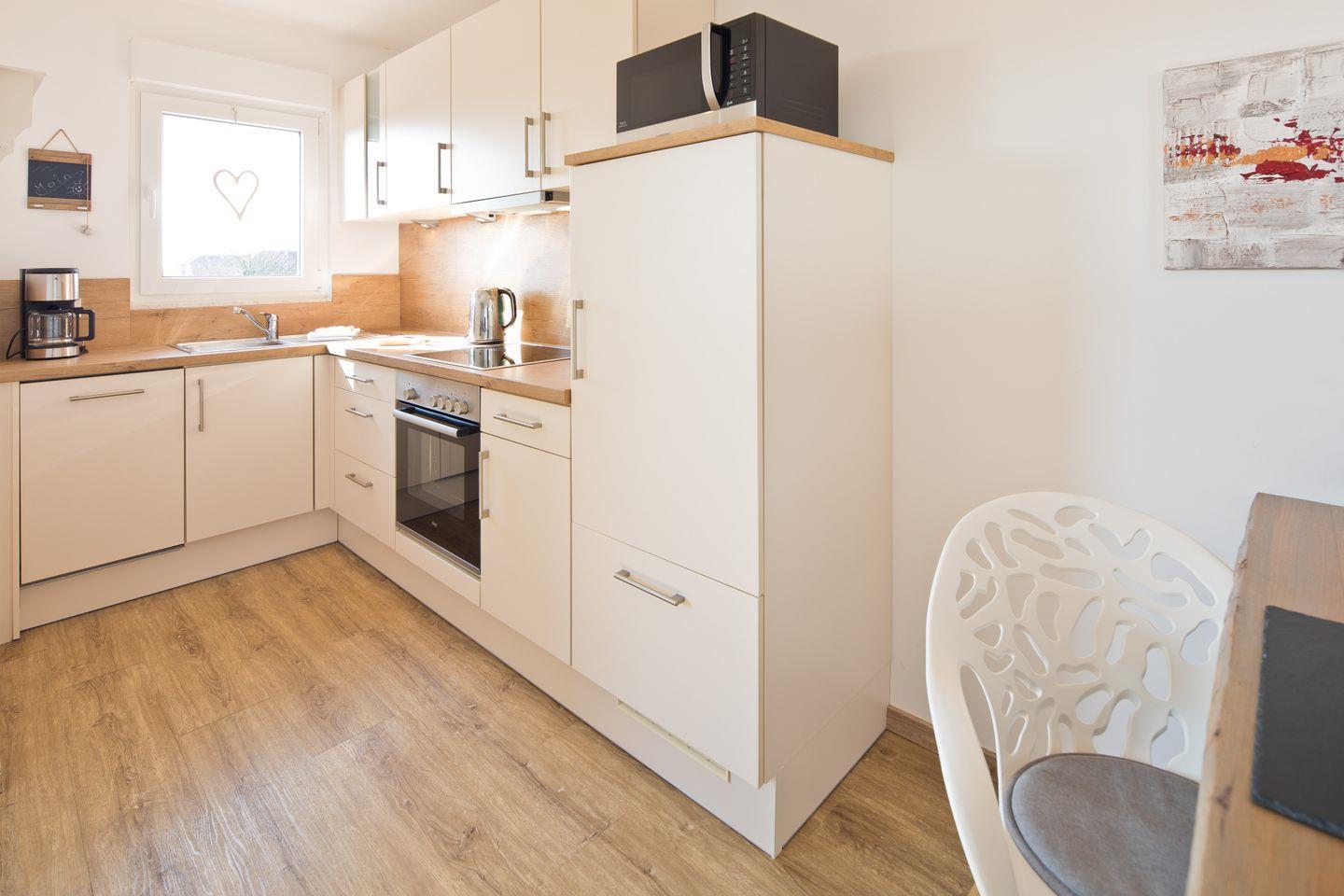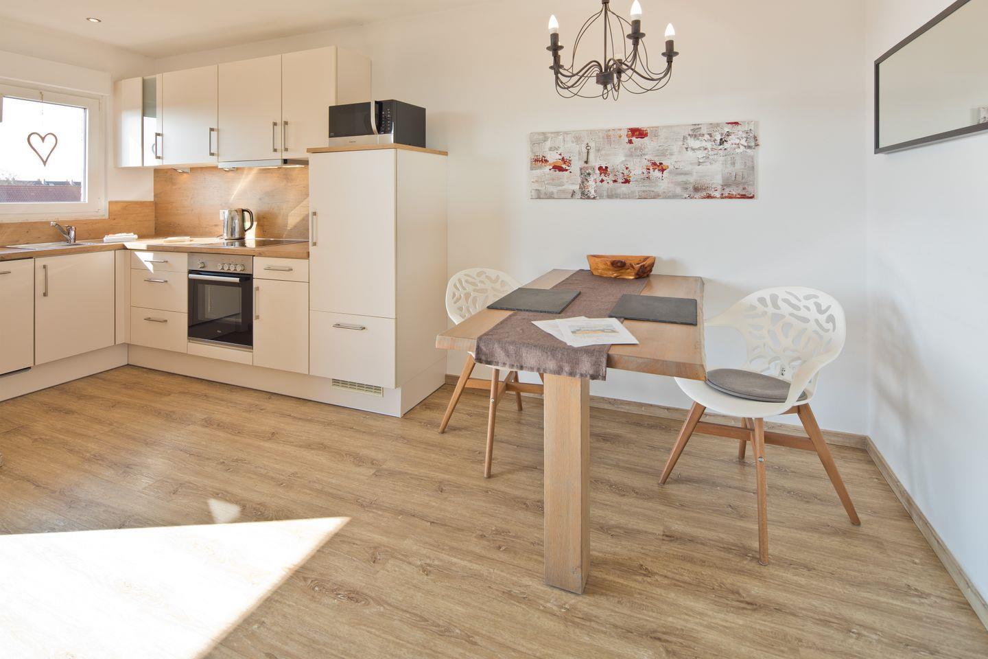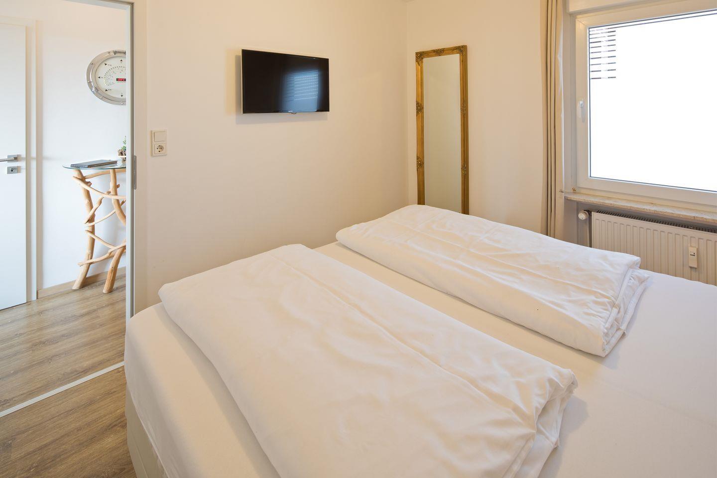 Ruhige Lage, strand- und zentrumsnah, moderne Ferienwohnung für 2 Personen mit einer Größe von ca. 55qm. Die Ferienwohnung wurde aufwendig renoviert und hochwertig und individuell eingerichtet.Das Schlafzimmer ist mit einem Doppelbett (elektr. Boxspringbett, 180cm) einem geräumigem Schrank und 32" Flat-TV ausgestattet. Im Wohnzimmer gibt es zwei Couch's vor einer gemütlichen Natursteinwand mit indirektem Licht, einen Esstisch sowie einen 40" Flat-TV. Die Küche ist voll ausgestattet. Das Bad hat eine flache Dusche und ein WC, im Abstellraum finden Sie eine Waschmaschine sowie weitere Haushaltsutensilien.Die Ferienwohnung verfügt über kostenloses W-LAN.