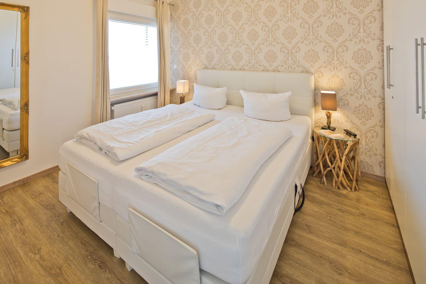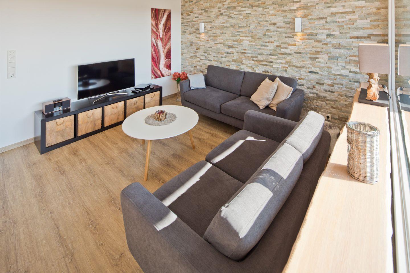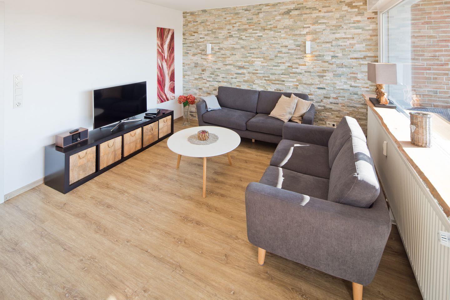 Willkommen in unserer ruhigen und modernen Ferienwohnung in Norddeich, ideal für 2 Personen und nur wenige Schritte vom Strand und dem Zentrum entfernt. Die 55qm große Wohnung befindet sich im 2. Obergeschoss, wurde aufwendig renoviert und bietet hochwertige, individuelle Einrichtungsdetails. Das Schlafzimmer ist mit einem elektrischen Boxspringbett (180cm), einem geräumigen Schrank und einem 32” Flat-TV ausgestattet. Im Wohnzimmer laden zwei komfortable Couches vor einer beeindruckenden Natursteinwand mit indirekter Beleuchtung zum Entspannen ein. Ein Esstisch und ein 55” Curved-TV ergänzen den Wohnbereich. Die voll ausgestattete Küche und das moderne Bad mit einer flachen Dusche und WC erfüllen alle Ihre Bedürfnisse. Praktische Annehmlichkeiten wie eine Waschmaschine, zusätzliche Haushaltsutensilien im Abstellraum, kostenloses W-LAN und elektrische Rollläden sorgen für Komfort und Sicherheit während Ihres Aufenthaltes.