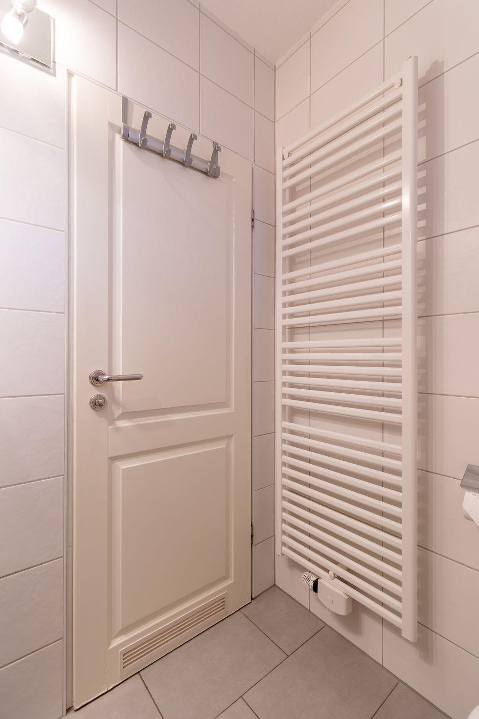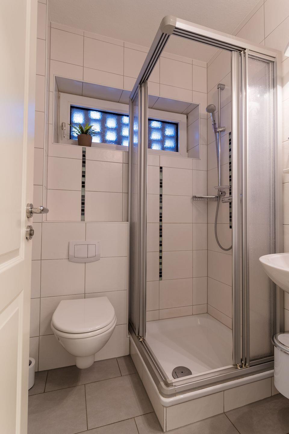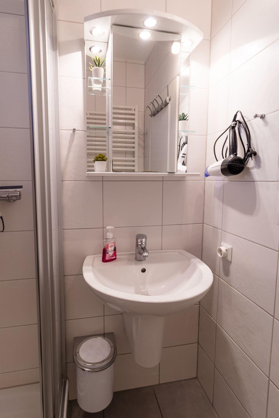 Das Badezimmer ist mit einer Dusche, einem WC sowie einer Waschkombination mit Spiegelschrank ausgestattet. Ein Haartrockner liegt für Sie bereit.