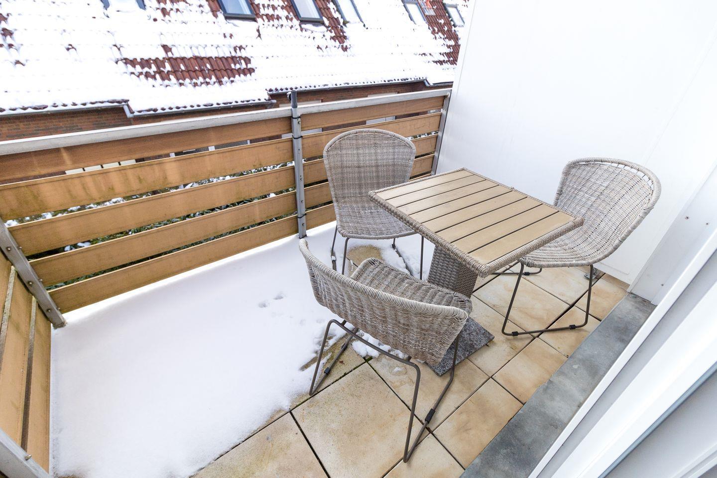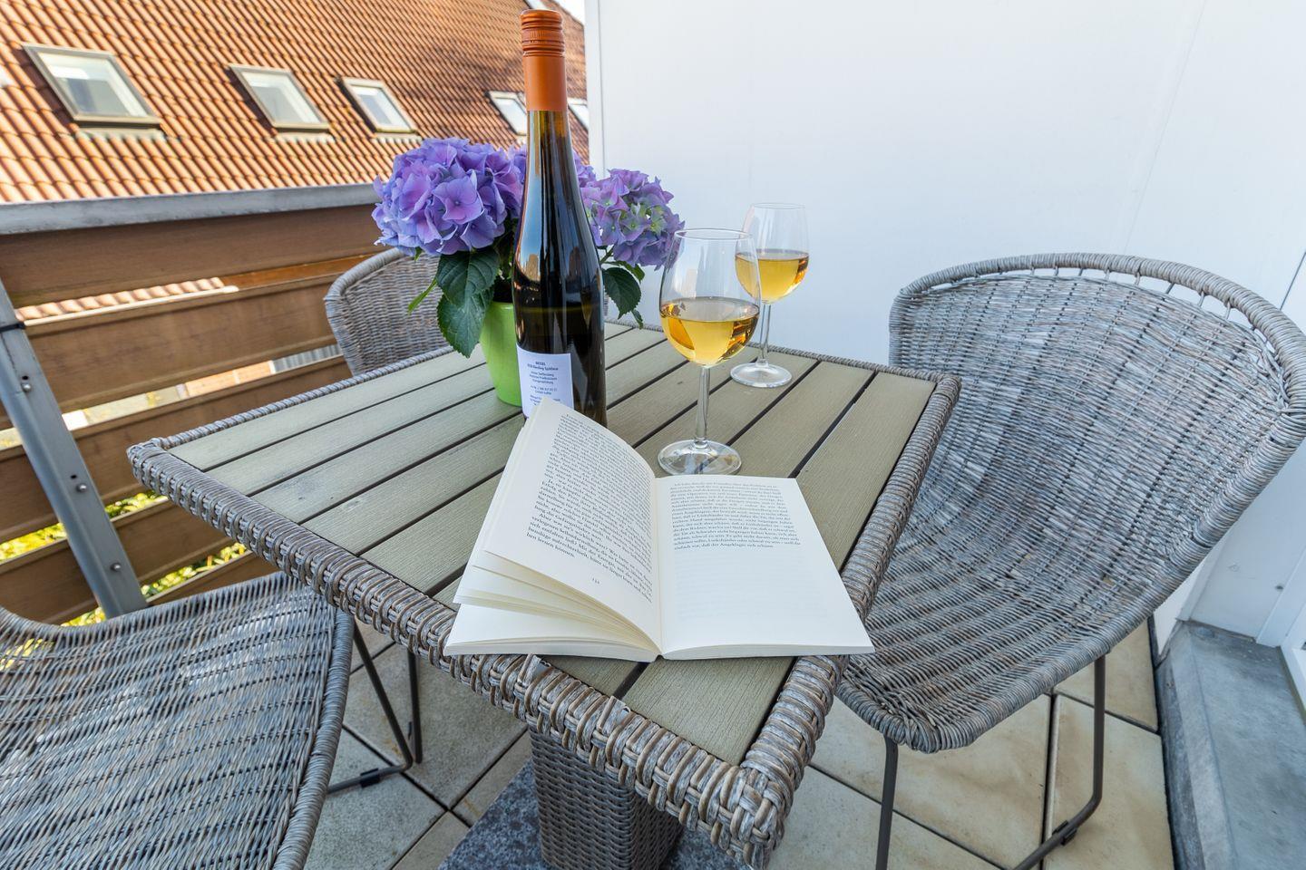 Der Balkon ist zur Südseite gelegen und mit bequemen Gartenmöbeln ausgestattet. Hier können Sie Ihr Frühstück in der Sonne genießen oder an lauen Sommerabenden bei einem kühlen Glas Wein verweilen.