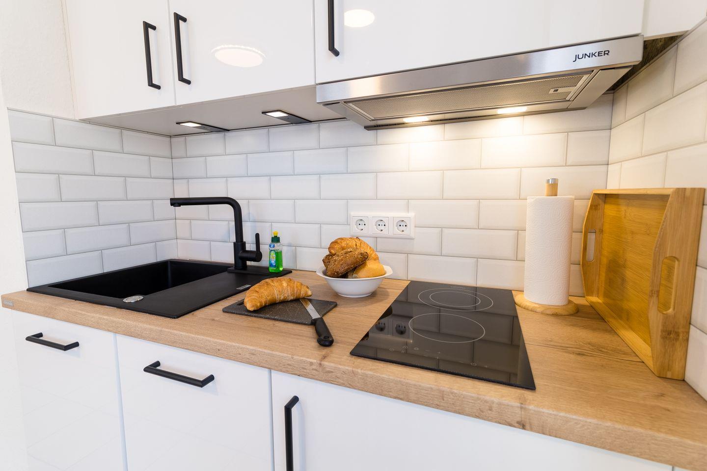 Die Ausstattung der im Jahr 2025 neu eingebauten Küche beinhaltet einen Herd mit Backofen, eine Kaffeemaschine, einen Kühlschrank mit Gefrierfach, eine Mikrowelle sowie einen Geschirrspüler.