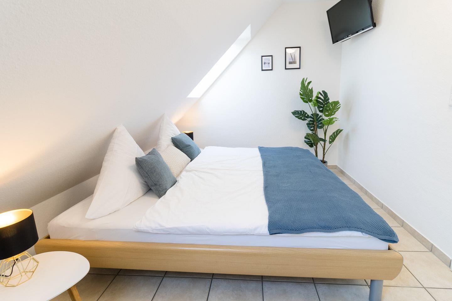 Im separaten Schlafzimmer stehen ein gemütliches 180 x 200 cm großes Doppelbett sowie ein Sessel für Sie bereit. Der vorhandene Kleiderschrank bietet Ihnen ausreichend Platz für Ihre mitgebrachte Garderobe. Fernsehabende im Bett zu verbringen ist kein Problem, denn auch in diesem Raum befindet sich ein TV-Gerät. Die Dachfenster lassen sich verdunkeln. Darüber hinaus ist genügend Platz für das Aufstellen eines Kinderbettes vorhanden, welches hinzugebucht werden kann.