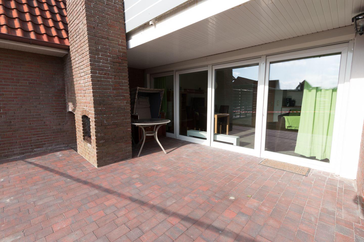 Auf der Terrasse können Sie aufgrund der Süd-West-Ausrichtung nachmittags und abends schöne, sonnige Stunden verbringen. Die Terrasse ist ausgestattet mit einem gemütlichen ostfriesischen Strandkorb, hochwertigen Gartenmöbeln und zwei Sonnenliegen samt Sonnenschirm. Der Gemeinschaftsgarten ist weiträumig eingezäunt und sowohl von der Terrasse als auch durch ein Gartentor vom Ferienwohnungs-Parkplatz erreichbar. Über einen Privatweg können ausschließlich die Gäste dieses Ferienhauses nach nur 50m zur Norddeicher Straße gelangen, wo Sie viele Restaurants, Cafés und Geschäfte vorfinden. Sie können die Wohnung auch über die Terrassentür verlassen, da diese abschließbar ist.