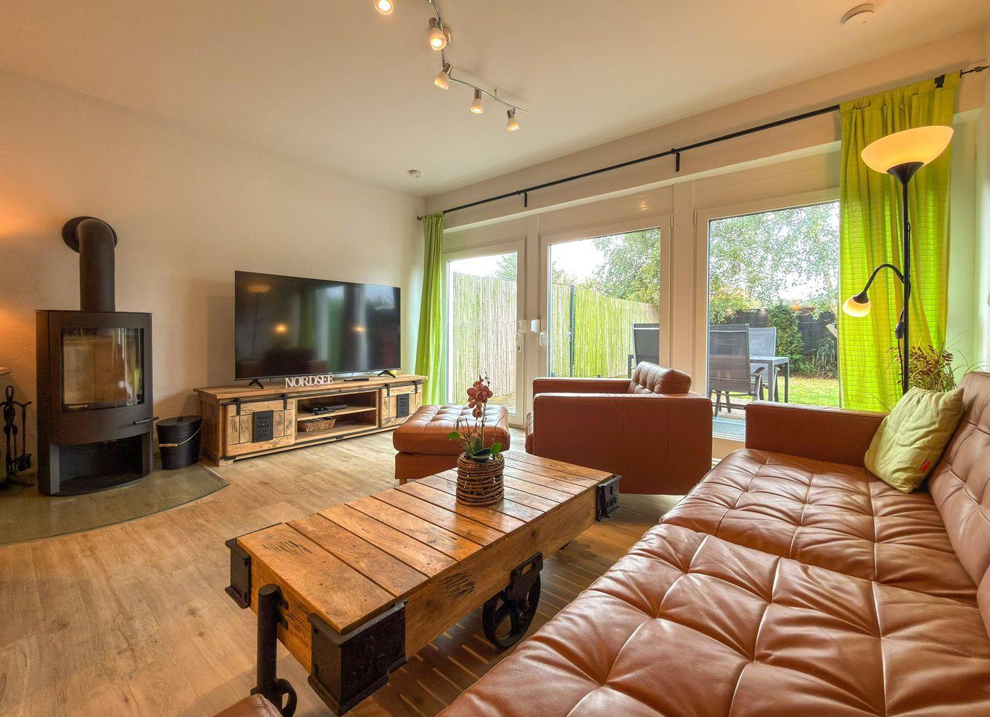 Gemütliche EG-Wohnung in Norddeich mit Terrasse, Kamin und eingezäuntem Garten für erholsame Urlaubstage.