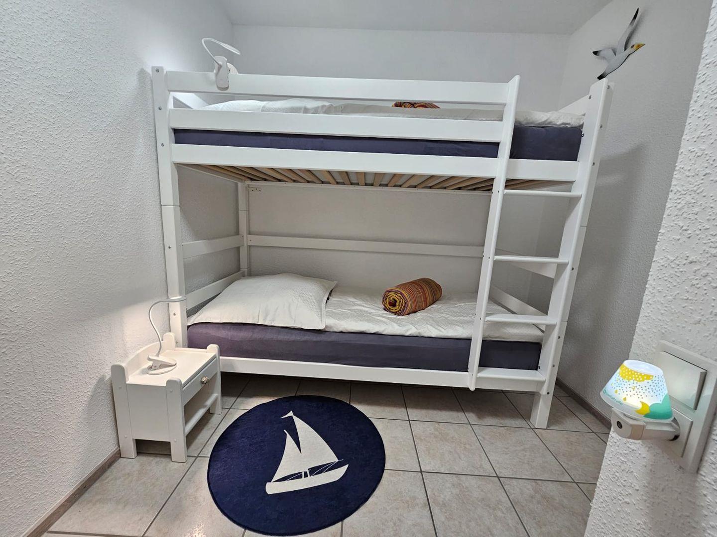 Kinderzimmer: Hochwertiges Stockbett (je 0,90?x?2,00?m) auch für Erwachsene geeignet (bis 140?kg je Bett). Deichschaf-Hocker „Oskar“ als Sitz- oder Fußhocker nutzbar (max. 120?kg).