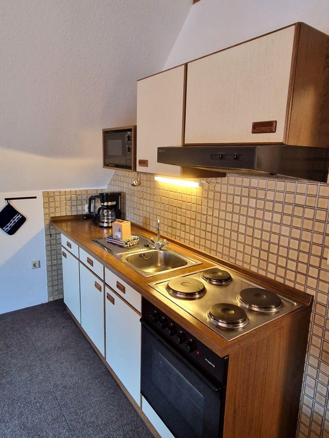 Ausgestattet ist die Küche mit einem 4 Platten Herd, Backofen und einer Mikrowelle.