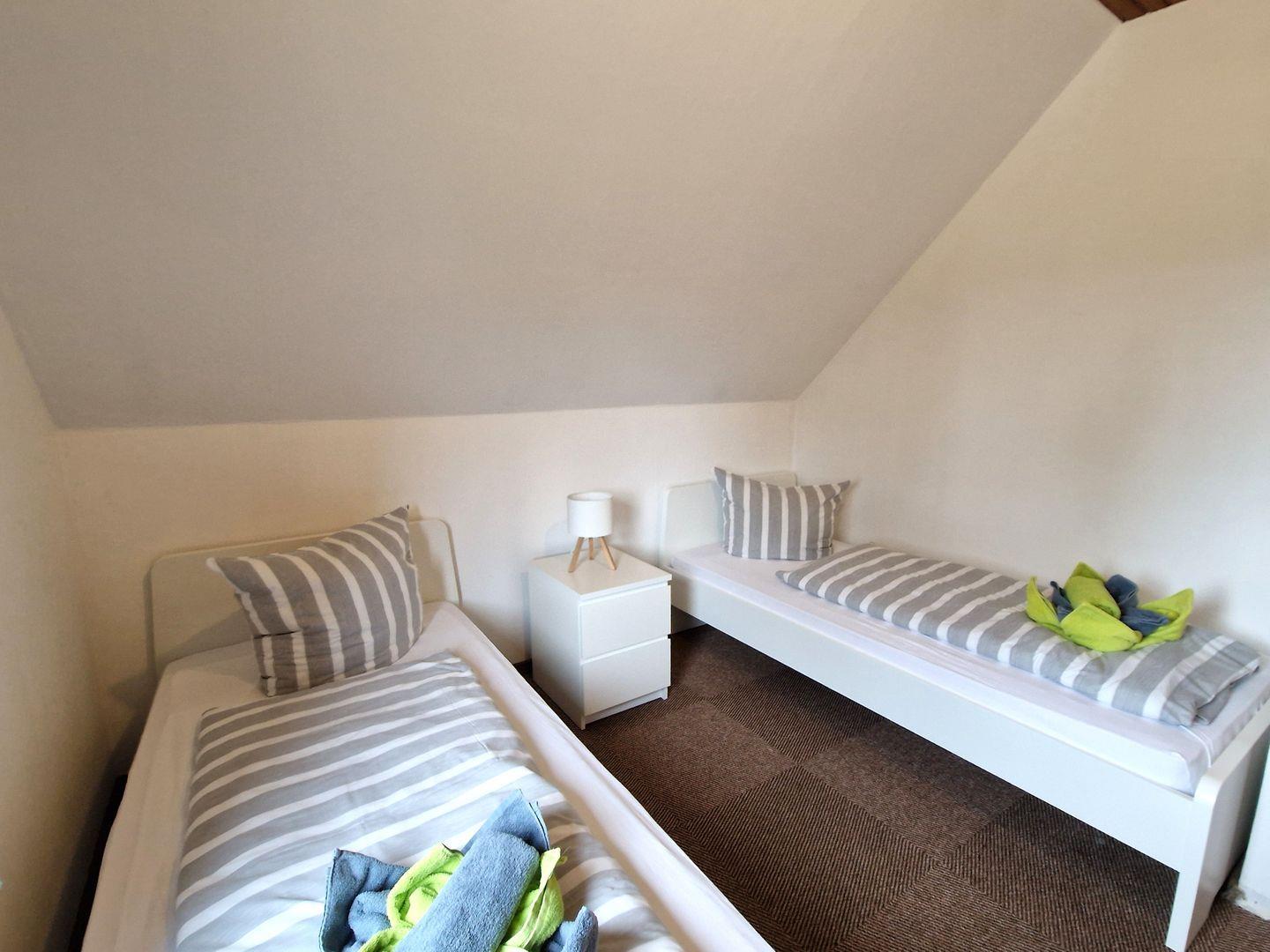 Weiter befinden sich in der Wohnung 2 Schlafzimmer, eins mit einem Doppelbett, das andere mit 2 Einzelbetten.