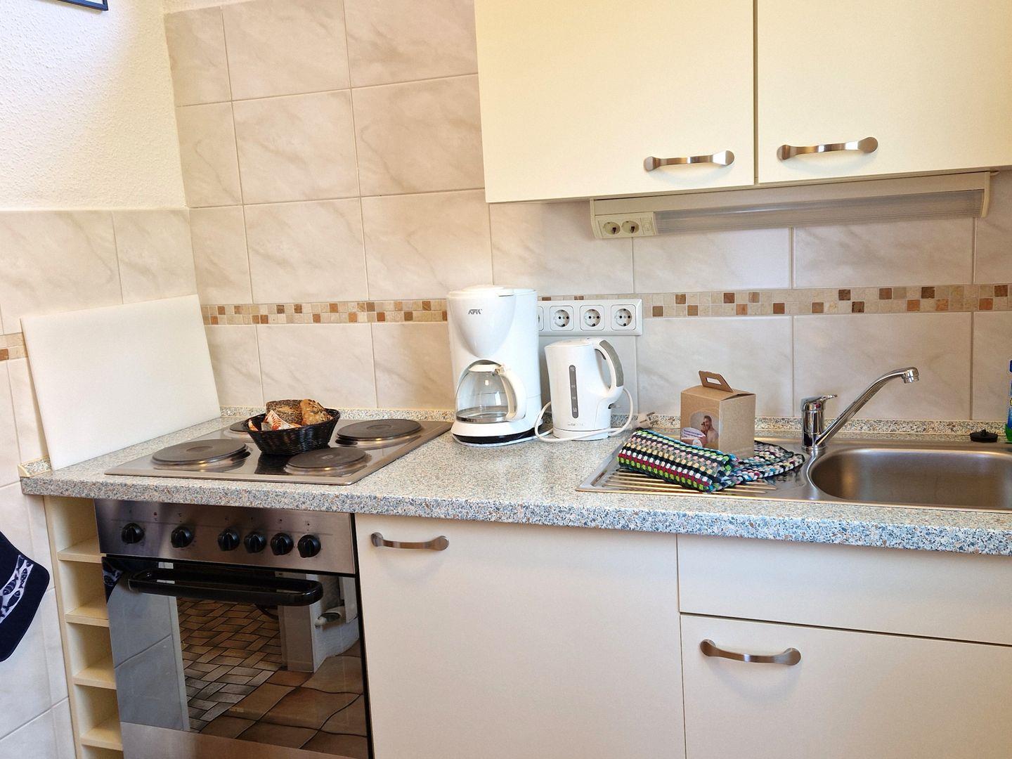 Ausgestattet ist die Küche mit einem 4 Platten Herd und einem Backofen.