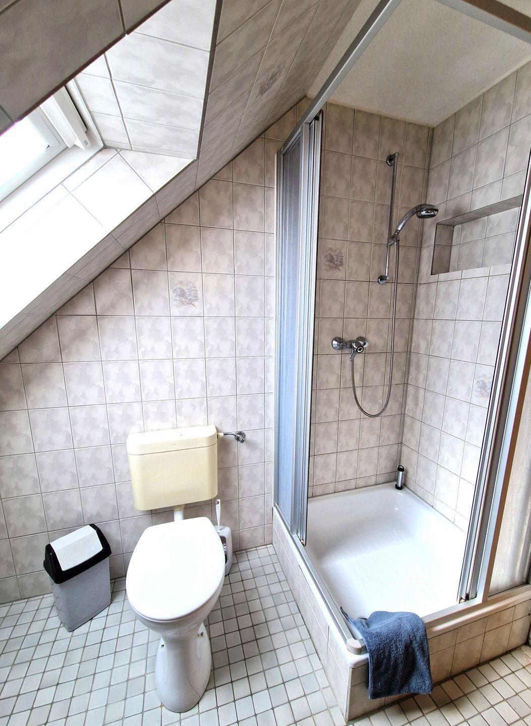 Das Bad ist mit Dusche und Fenster ausgestattet.