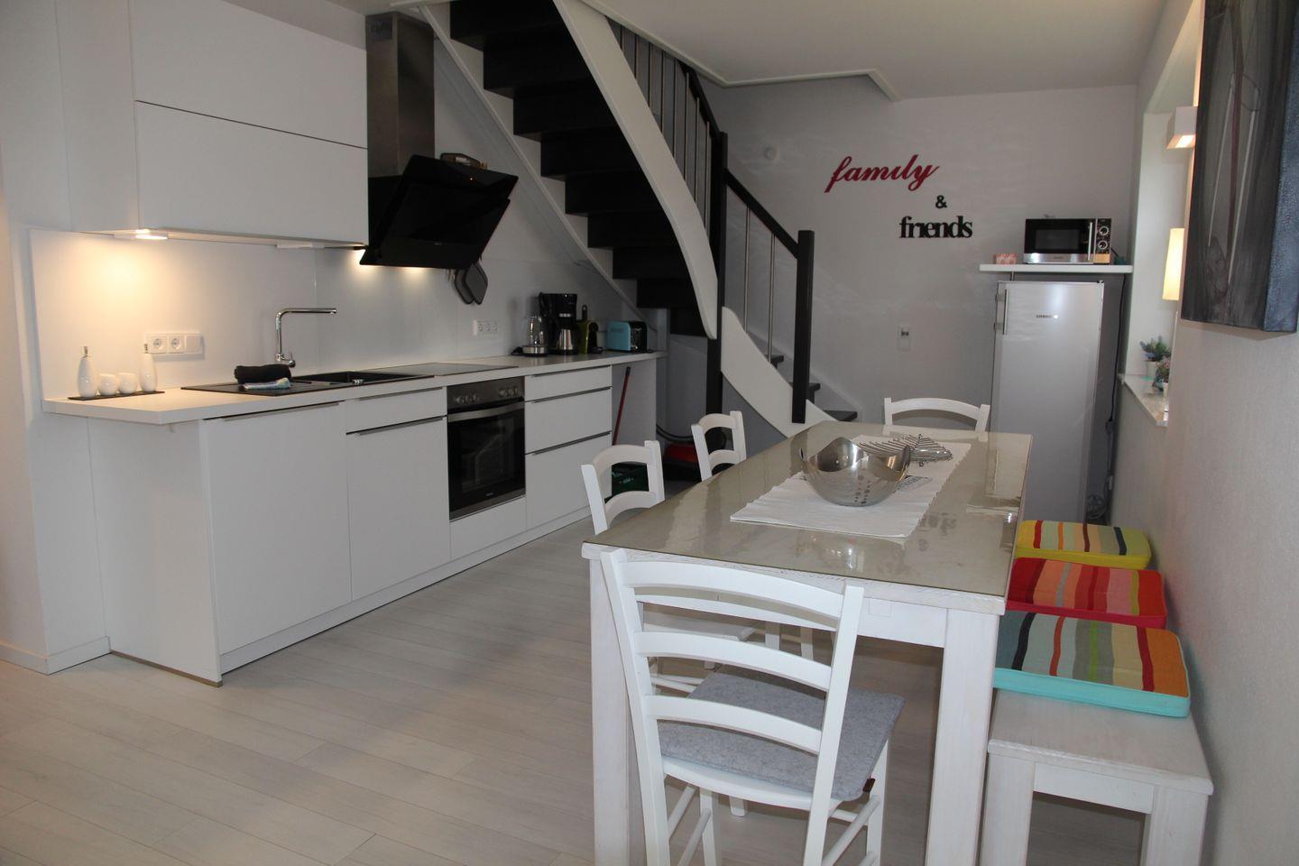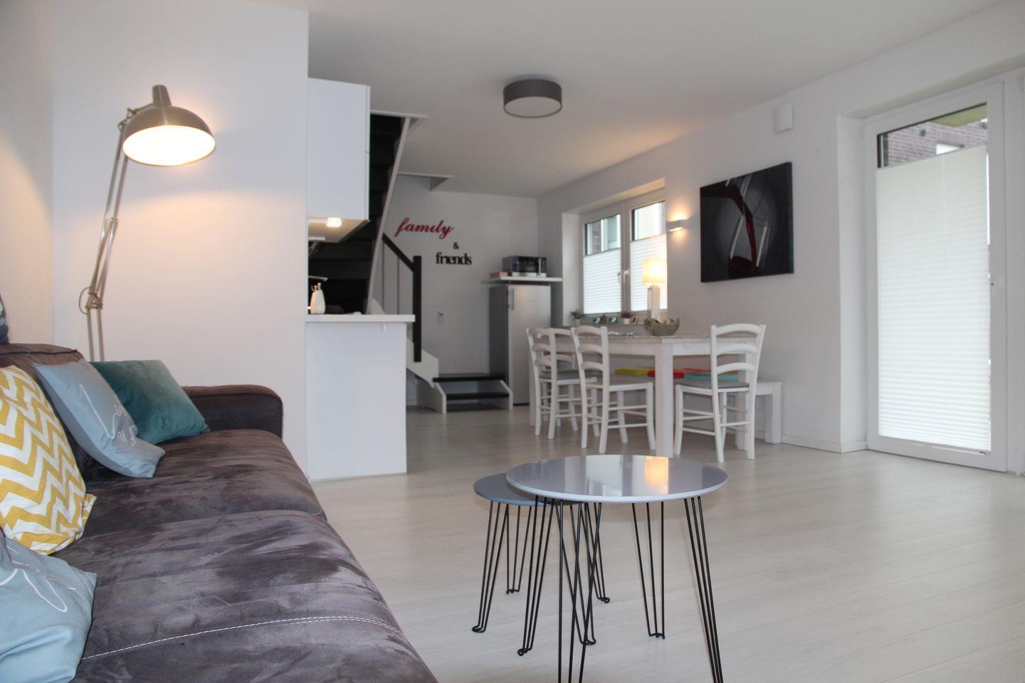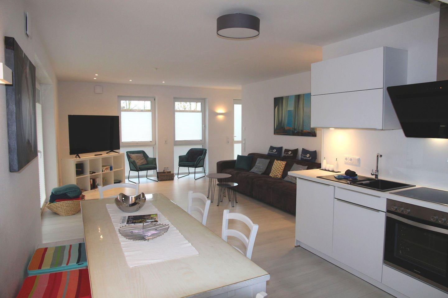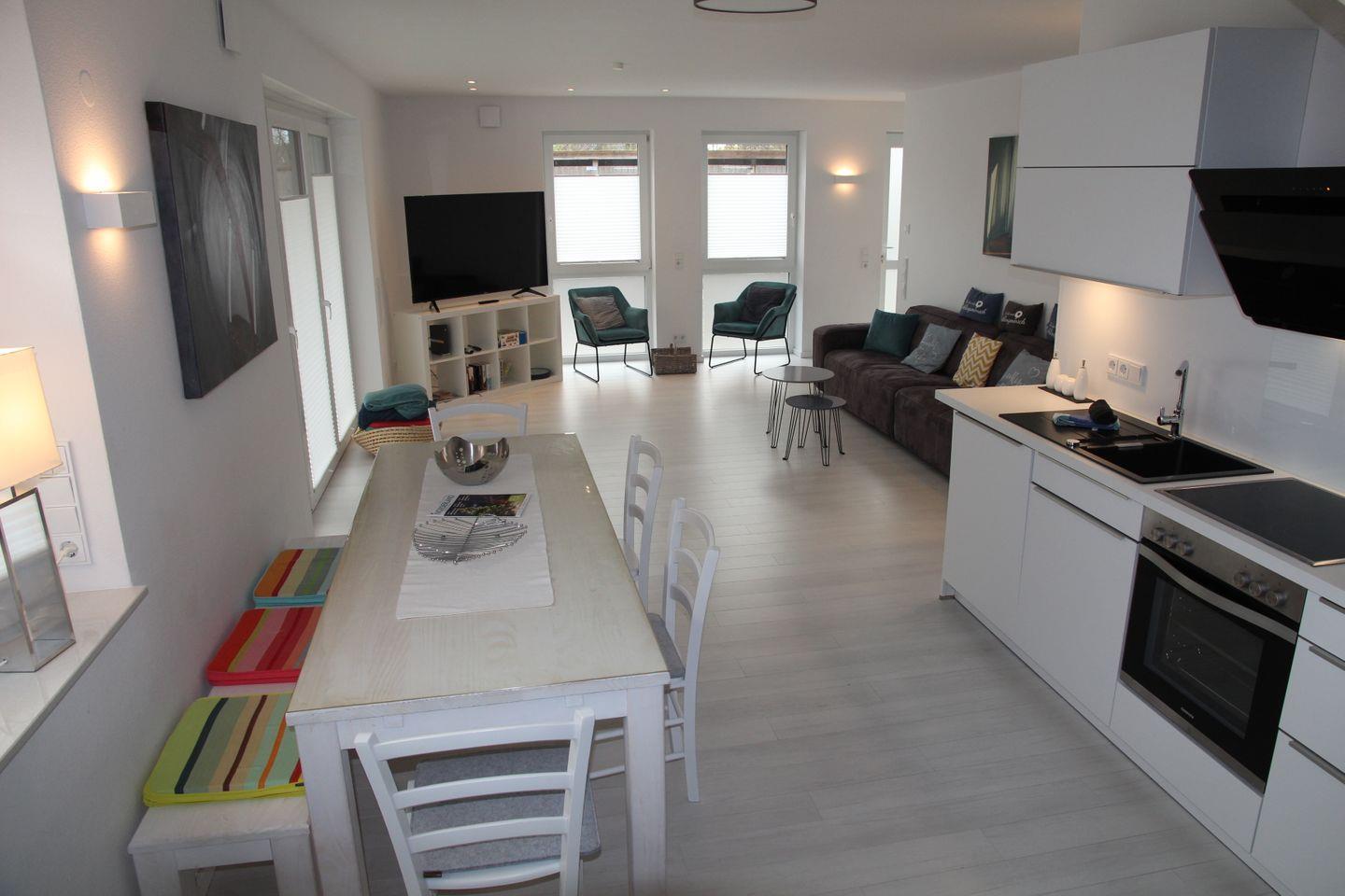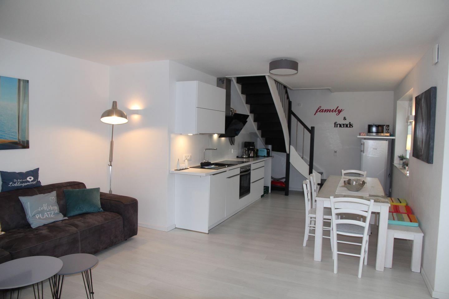 Der eigene Eingang direkt vom Parkplatz aus führt Sie direkt in den kleinen Flur, von dem aus Sie in den großzügigen Wohnbereich eintreten können. Hier befinden sich ein großes Sofa mit Blick auf den großen TV, sowie der Essbereich mit Sitzplätzen für 7 Personen und die vollausgestattete Küche, die u.a. über Geschirrspülmaschine, Backofen, Cerankochfeld, großen Kühlschrank mit Gefrierfach, Mikrowelle, Kaffeemaschine, Nespresso-Kapselmaschine, Wasserkocher und Toaster verfügt. Vom Wohnbereich gelangt man auch direkt auf die möblierte (6 Stühle, Tisch, Sonnenschirm) Terrasse mit Gartenbereich, der von einer kleinen Hecke umgeben ist.