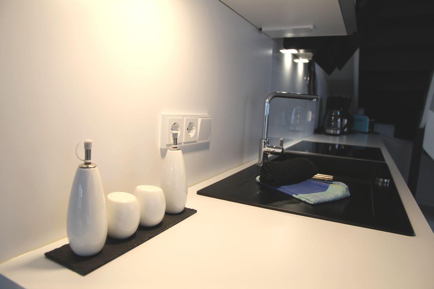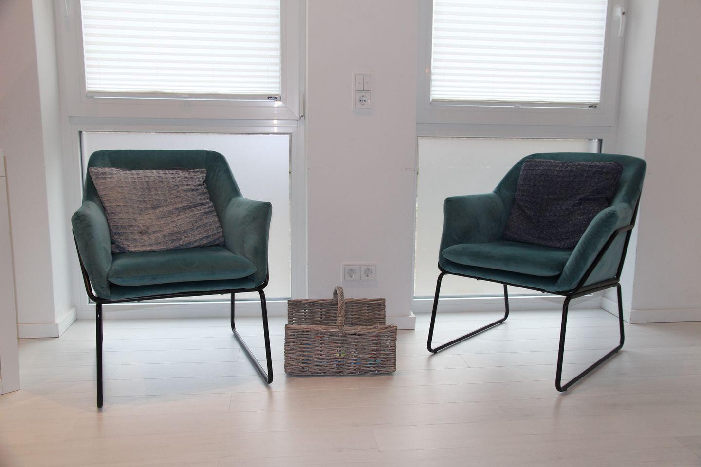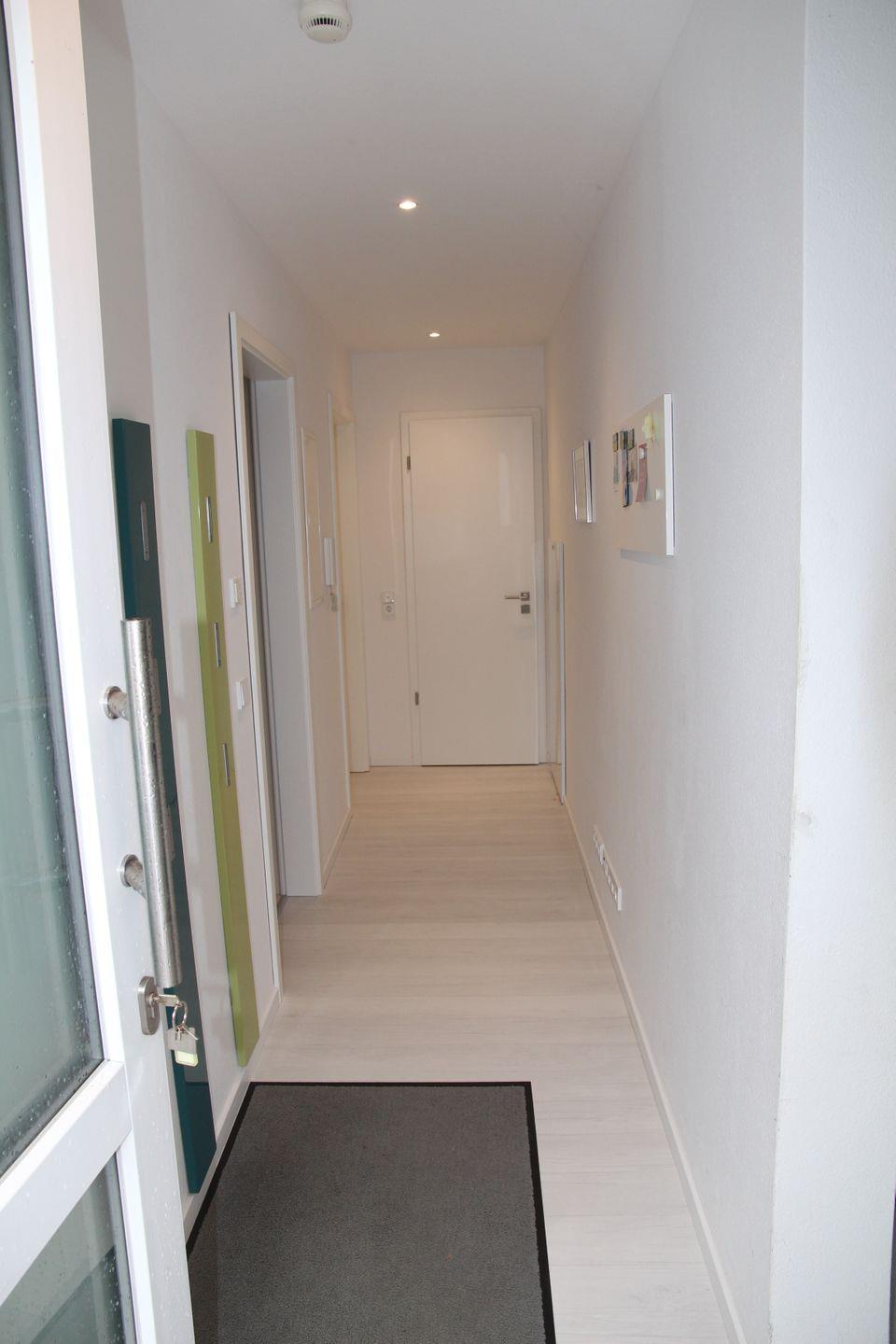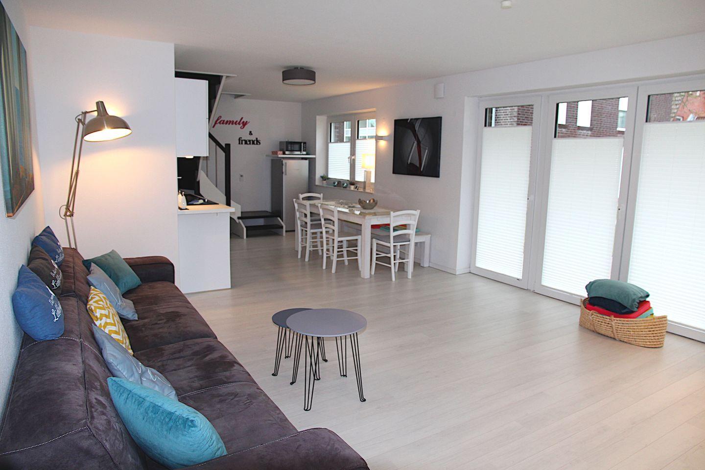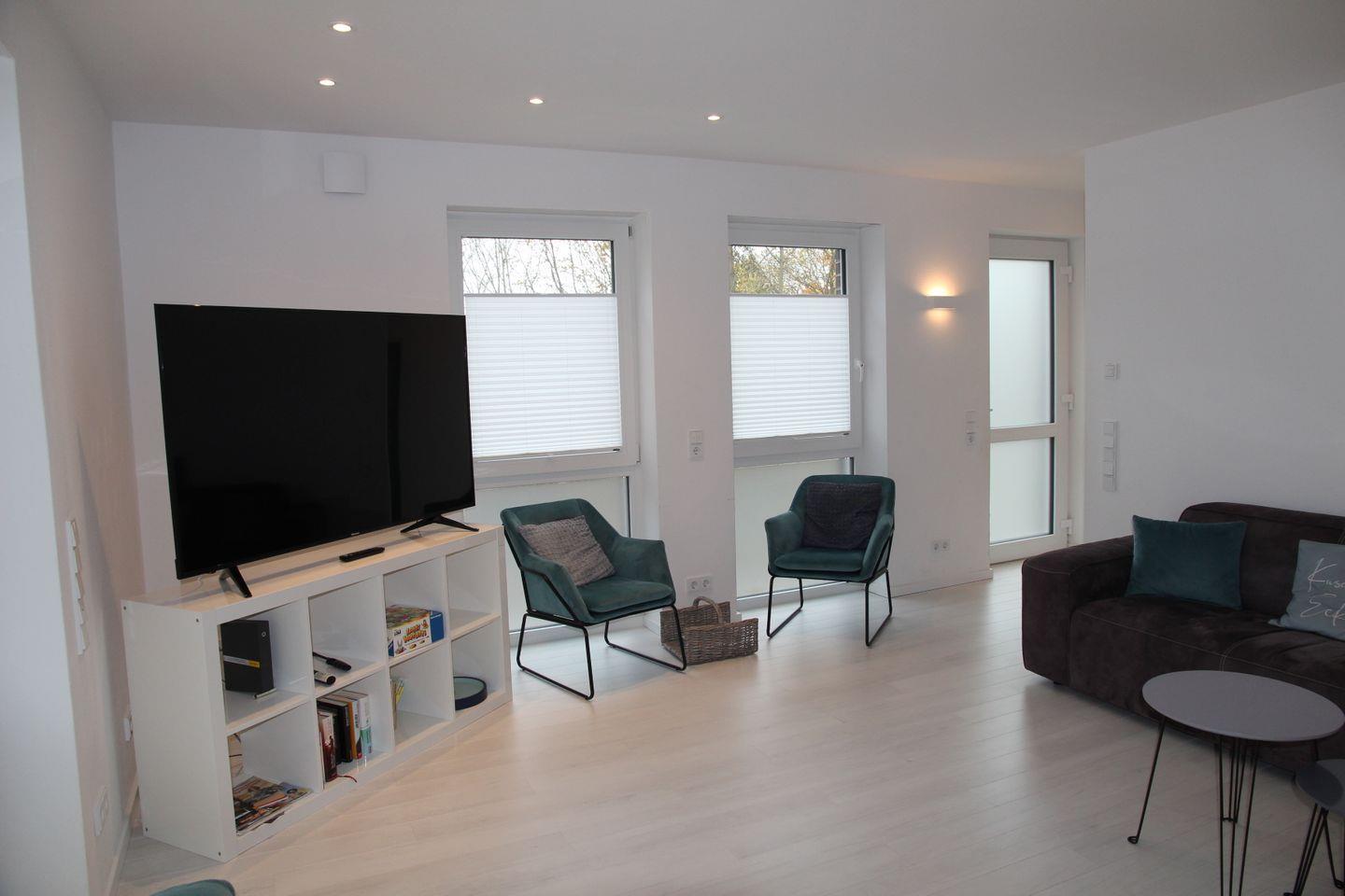 Der eigene Eingang direkt vom Parkplatz aus führt Sie direkt in den kleinen Flur, von dem aus Sie in den großzügigen Wohnbereich eintreten können. Hier befinden sich ein großes Sofa mit Blick auf den großen TV, sowie der Essbereich mit Sitzplätzen für 7 Personen und die vollausgestattete Küche, die u.a. über Geschirrspülmaschine, Backofen, Cerankochfeld, großen Kühlschrank mit Gefrierfach, Mikrowelle, Kaffeemaschine, Nespresso-Kapselmaschine, Wasserkocher und Toaster verfügt. Vom Wohnbereich gelangt man auch direkt auf die möblierte (6 Stühle, Tisch, Sonnenschirm) Terrasse mit Gartenbereich, der von einer kleinen Hecke umgeben ist.
