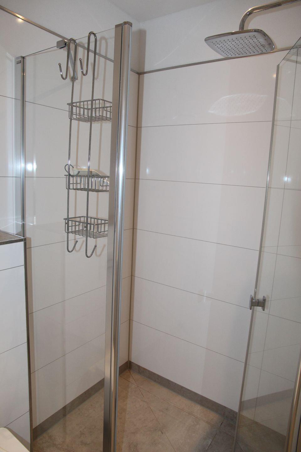 Die Wohnung verfügt im Erdgeschoss weiterhin über ein Schlafzimmer mit Boxspring-Doppelbett (durchgehender Topper, 1,80 m), Sessel und Kleiderschrank, sowie die beiden Badezimmer: Eines der Badezimmer ist mit großer, ebenerdiger Dusche, elektrischem Handtuchheizkörper, Fenster, WC, Waschbecken, Waschmaschine, Wäscheständer und Föhn ausgestattet, das zweite Badezimmer verfügt über eine weitere bodentiefe Dusche, Pissoir, WC und ein kleines Waschbecken.