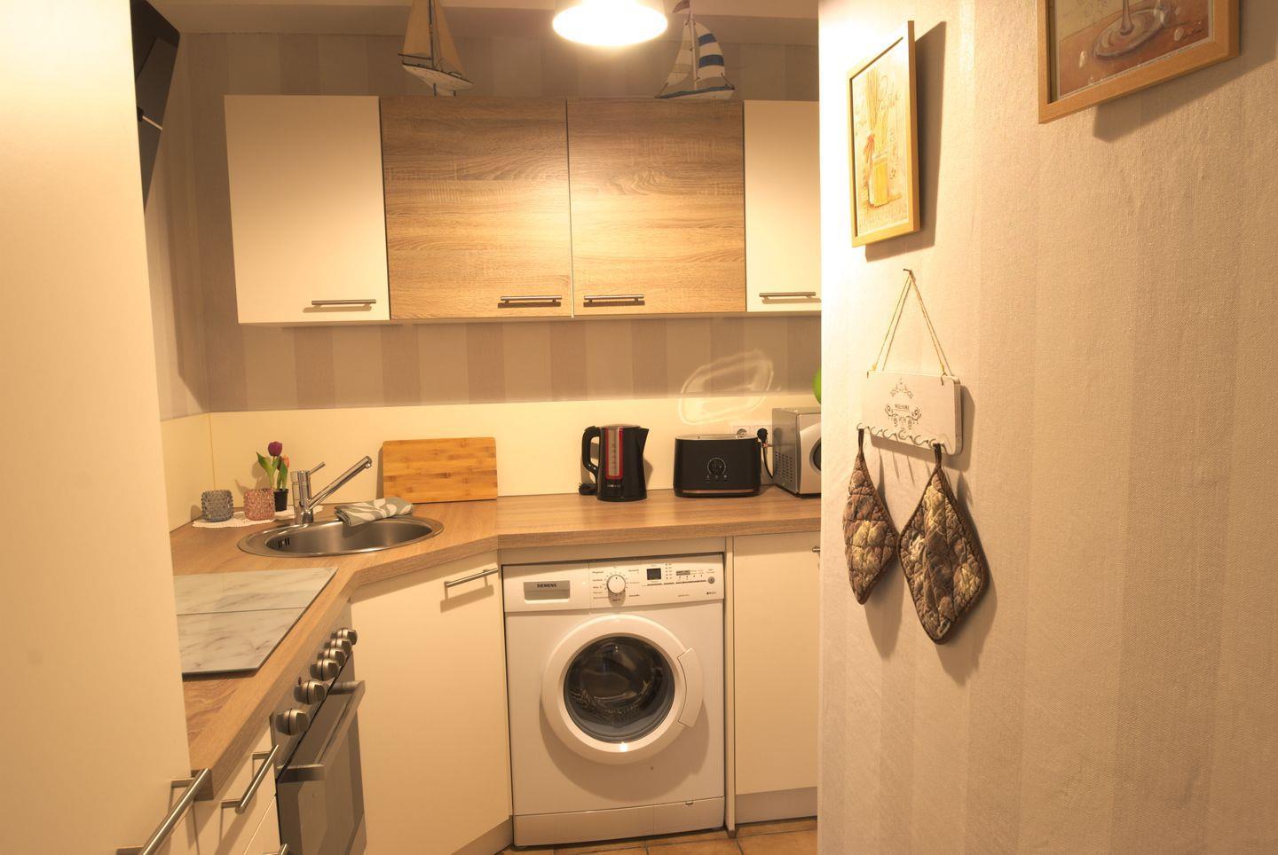 Die Küche ist gut ausgestattet: Sie hat einen Kühlschrank mit Gefrierfach, Ceran-Kochfeld, Backofen, Mikrowelle, Spülmaschine, Filter-Kaffeemaschine, Eierkocher, Toaster, Wasserkocher und eine Waschmaschine, sodass Sie sich wie zu Hause fühlen können. Das Badezimmer verfügt über einen Fön und bietet ausreichend Platz für Ihr Wohlbefinden.
