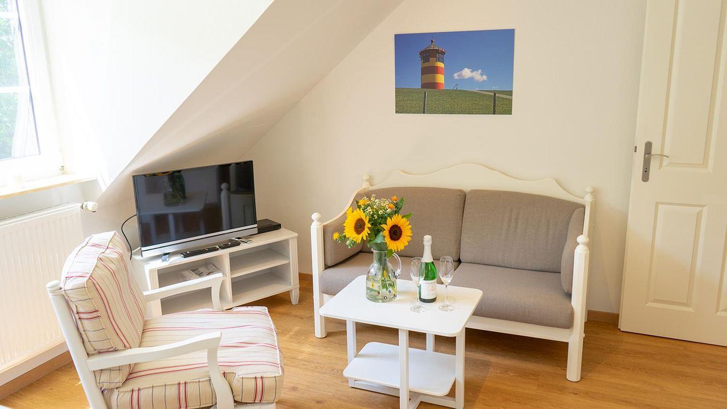 Das einladende Wohnzimmer ist mit einem Sofa und einer Sofaecke ausgestattet, die zum Entspannen einlädt. Hier können Sie einen gemütlichen Abend mit einem Filmabend verbringen, dank des digitalen TV-Programms oder nutzen Sie den DVD-Spieler für Ihre Lieblingsfilme. Für die digitale Vernetzung steht Ihnen kostenfreies WLAN zur Verfügung, sodass Sie auch im Urlaub keine wichtigen Nachrichten verpassen müssen.