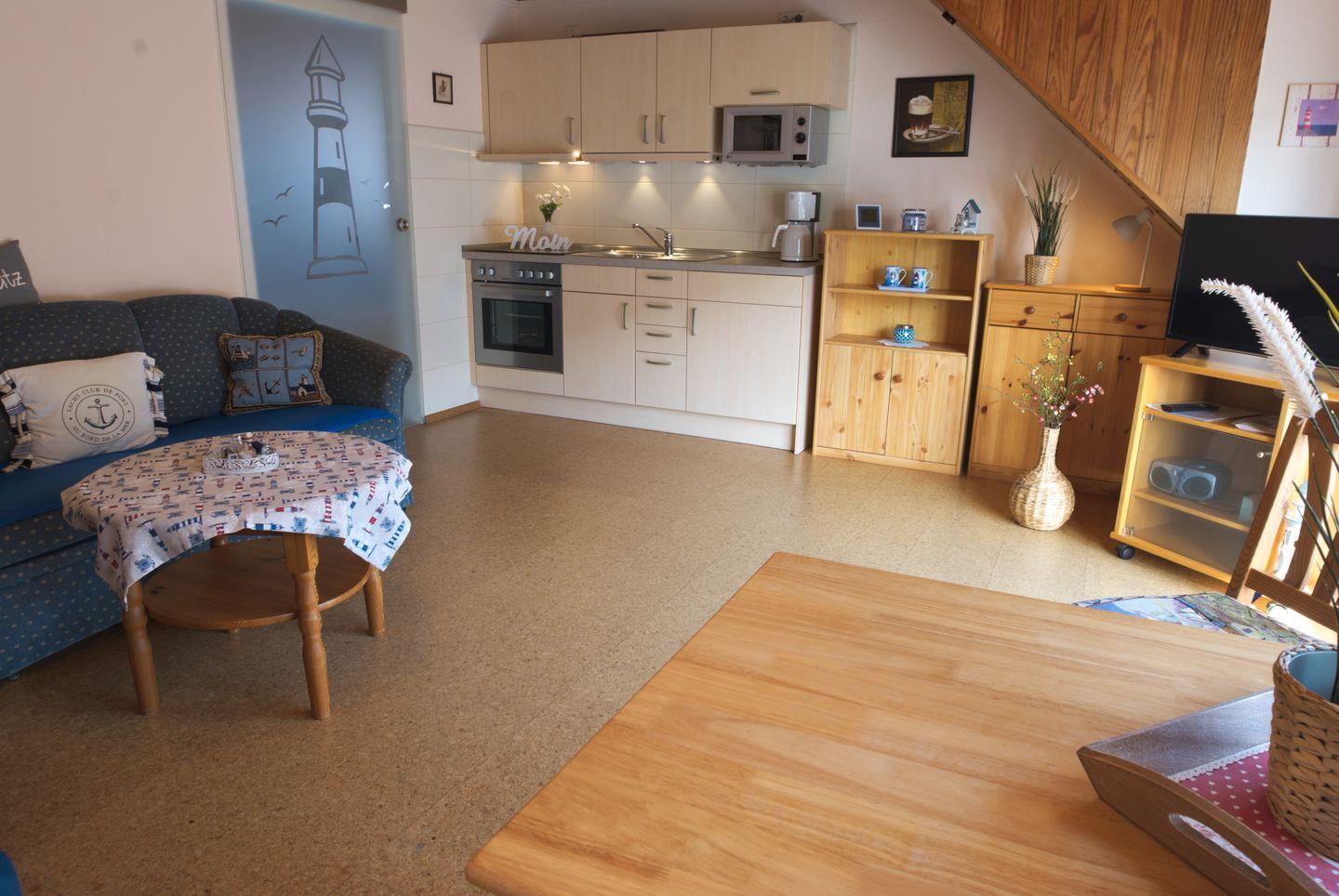 Sie bietet einen gemütlichen Wohnraum mit Schlafcouch, Sesseln, SAT-TV, kostenloses W-LAN, Essplatz, einen Südbalkon mit Gartenmöbeln, Küchenzeile mit Cerankochfeld, Backofen, Kühlschrank mit Gefrierfach, Mikrowelle, Kaffeemaschine, Wasserkocher und ein modernes Tageslichtbad mit Flachwannendusche. Hinter einer maritimen Glasschiebetür befindet sich ein Schlafzimmer mit 2 Einzelbetten. Ein abschließbarer Einzelfahrradschuppen und ein kostenloser PKW-Parkplatz vor dem Haus sind ebenfalls vorhanden