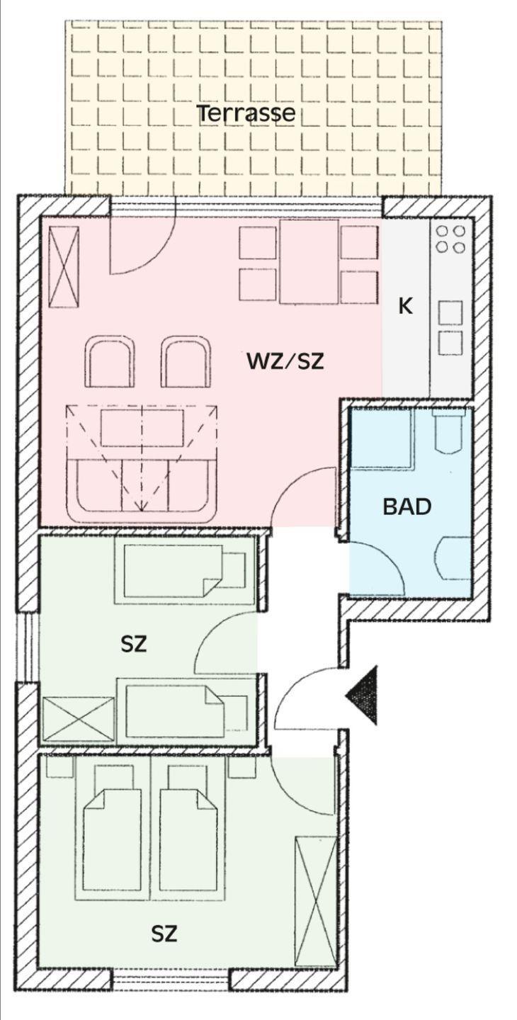 Weiter finden Sie hier zwei gemütliche Schlafzimmer, eins mit einem Doppelbett und eins mit zwei Einzelbetten. Ferner verfügt die Wohnung über ein Duschbad.