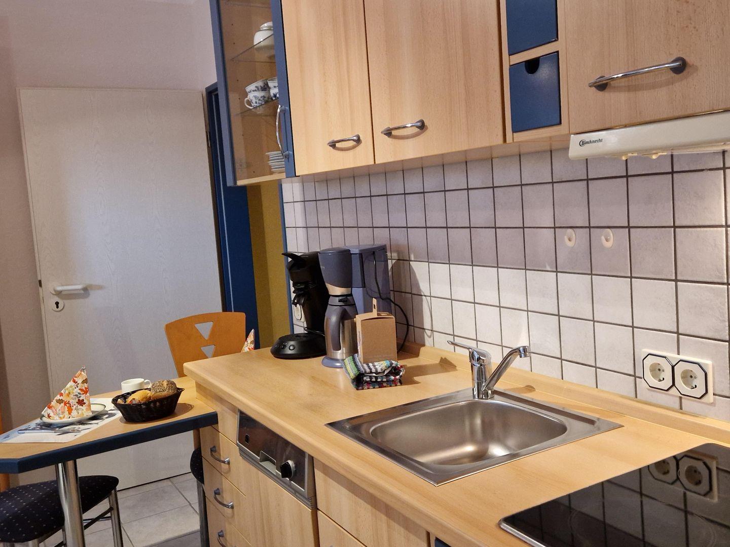 Ferner sind ein Toaster, Wasserkocher und eine Kaffeemaschine vorhanden.