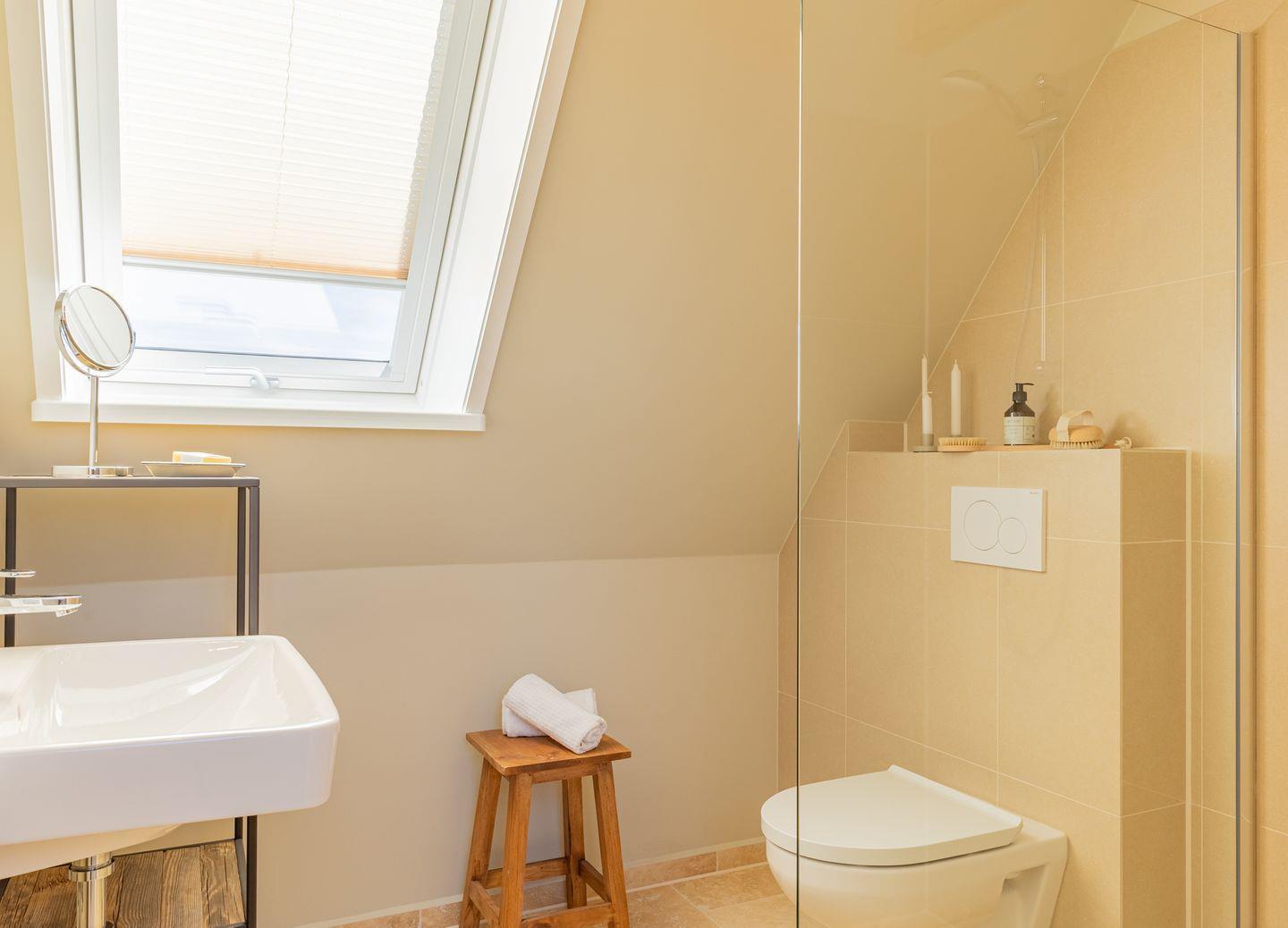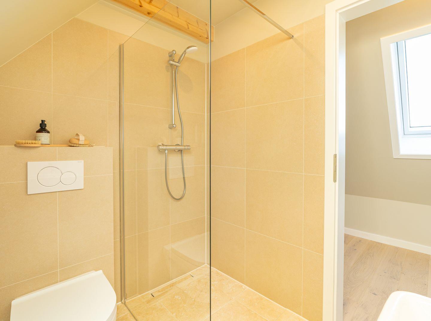 Das neue Bad ist mit hellem Naturstein gefliest. Die offene bodentiefe Dusche ist begehbar und hat eine gläserne Seitenwand.