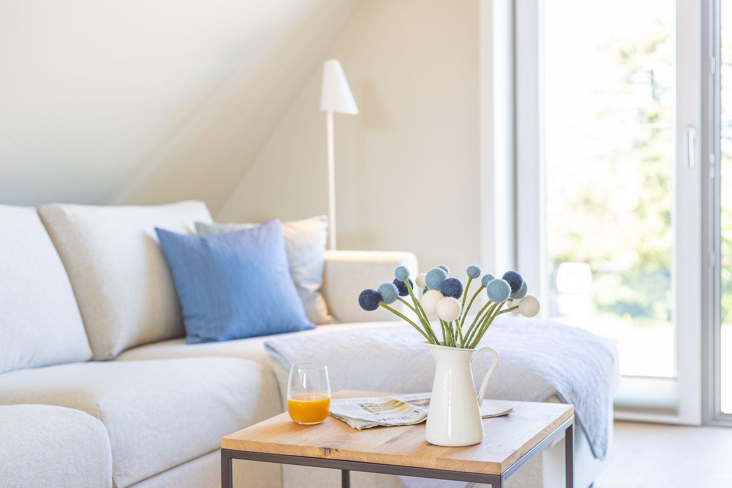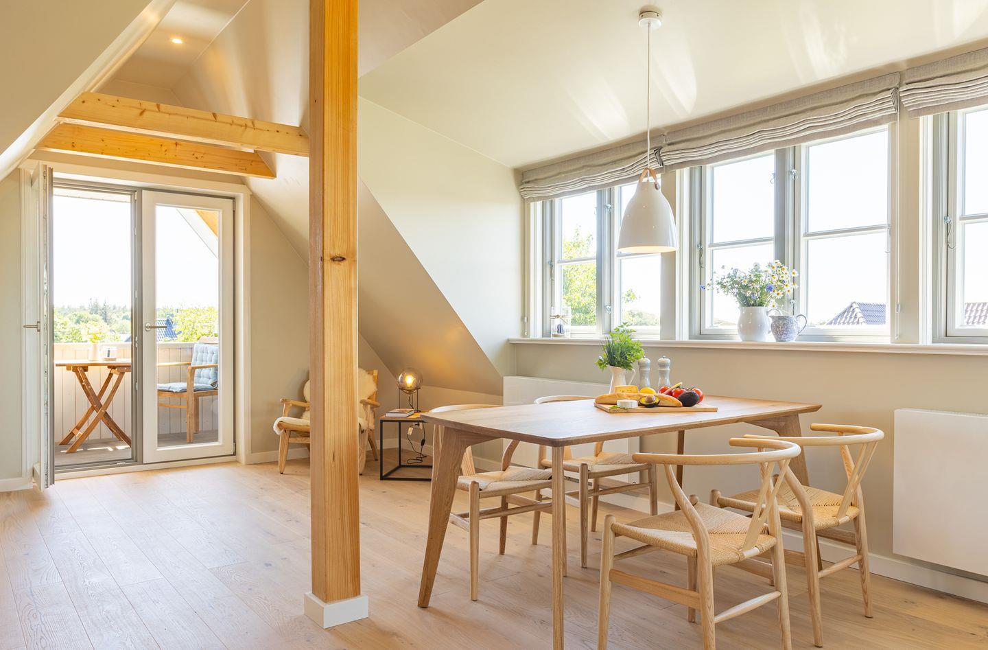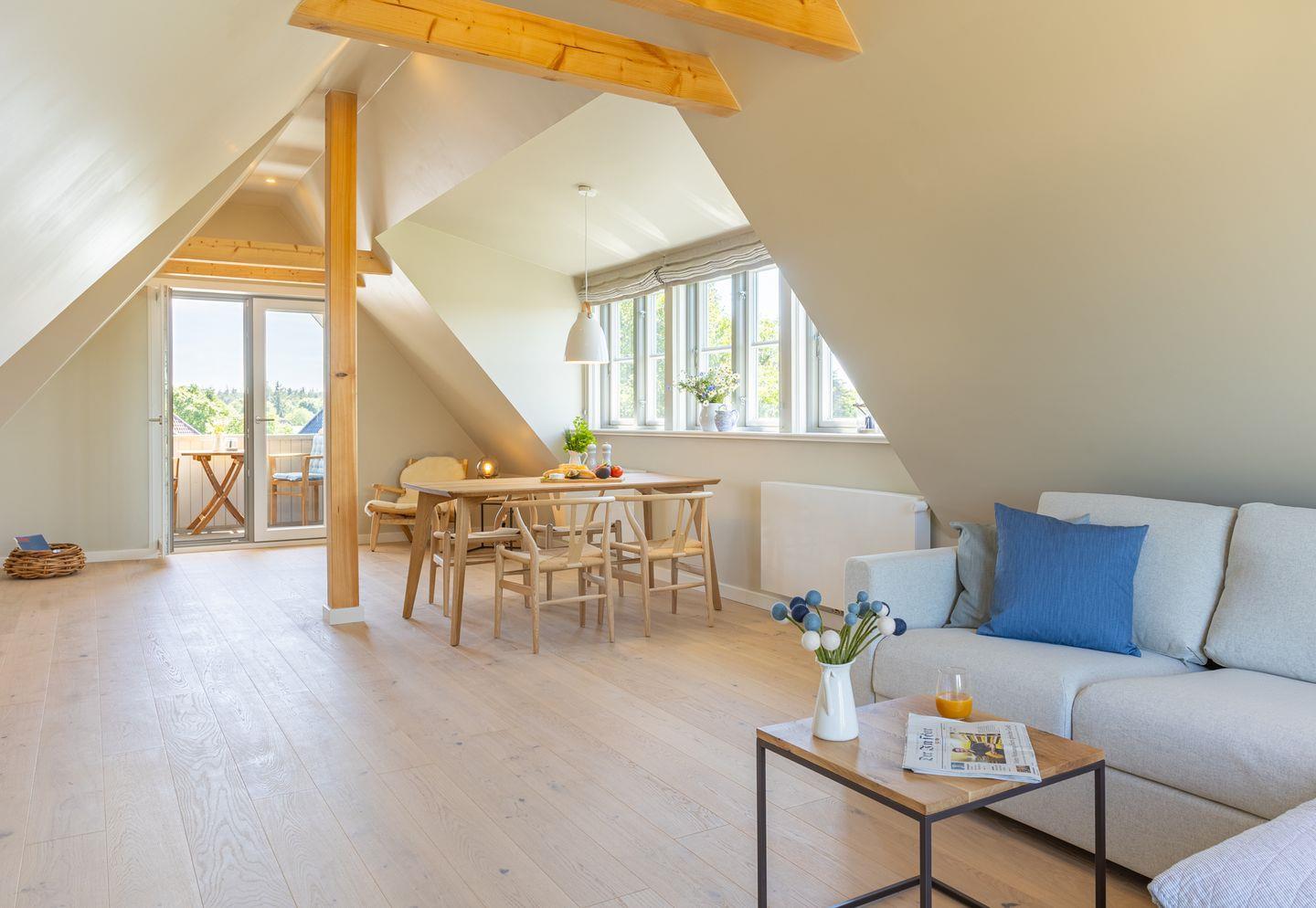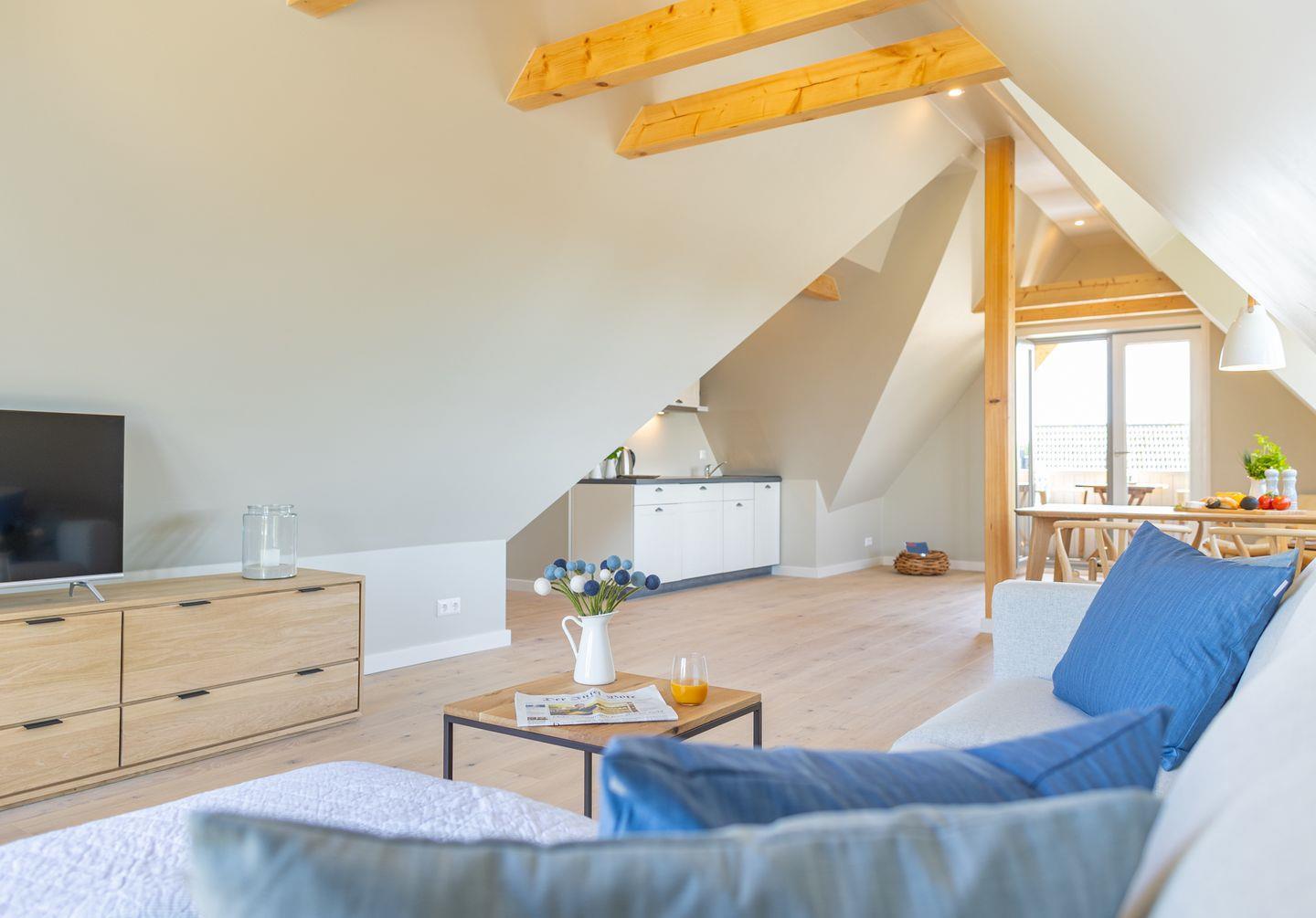 Diese 84qm² große Wohnung 1 liegt im zweiten Obergeschoß des Hauses. Sie ist hell und geschmackvoll eingerichtet und wird Ihnen vom ersten Tag an Erholung bieten. Diese elegant, im nordischen Stil gestaltete Ferienwohnung ist ein optimaler Ausgangspunkt für Ihre Aktivitäten. Sie ist mit ihren skandinavischen und hochwertigen Möbeln die Wohlfühloase Ihres Inselurlaubes. Hier erwartet Sie ein Schlafzimmer mit einem 1,60m großem Boxspringbett. Im Wohn- und Essbereich ist eine Küche integriert. Die Küche ist mit allen Utensilien ausgestattet. Der Wohnbereich mit TV, einem Ecksofa und zwei Sesseln lädt zu erholsamen Stunden ein.