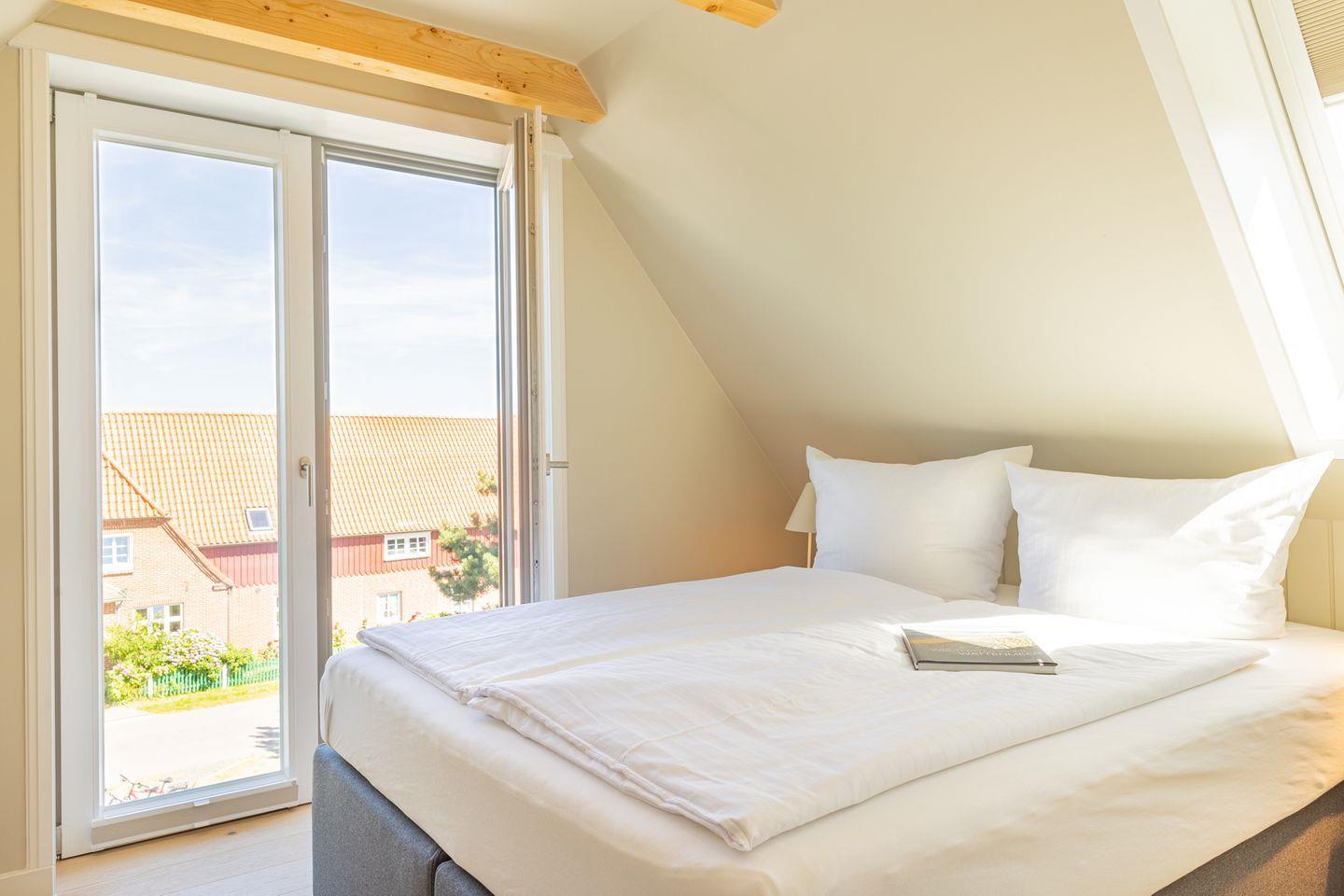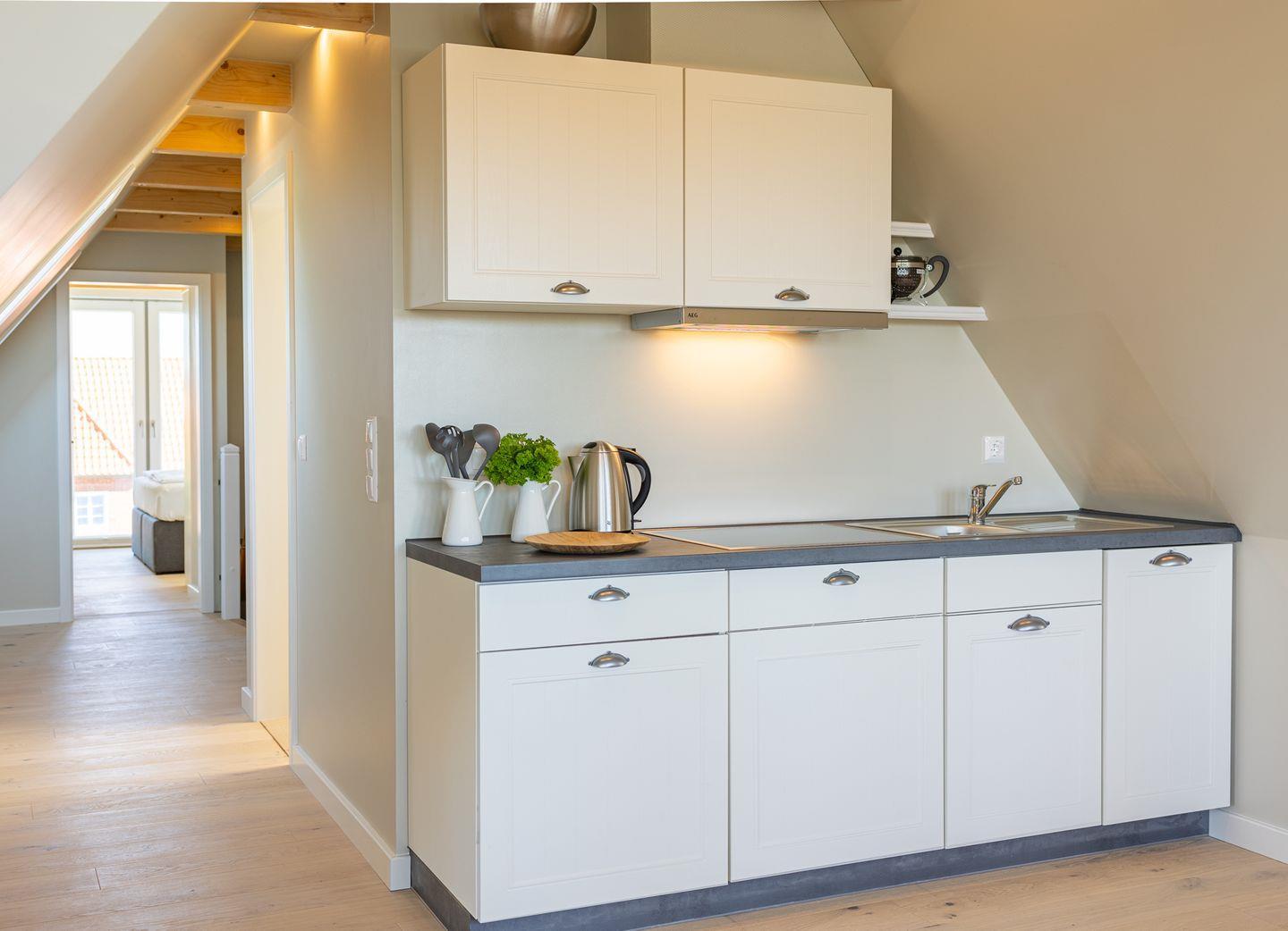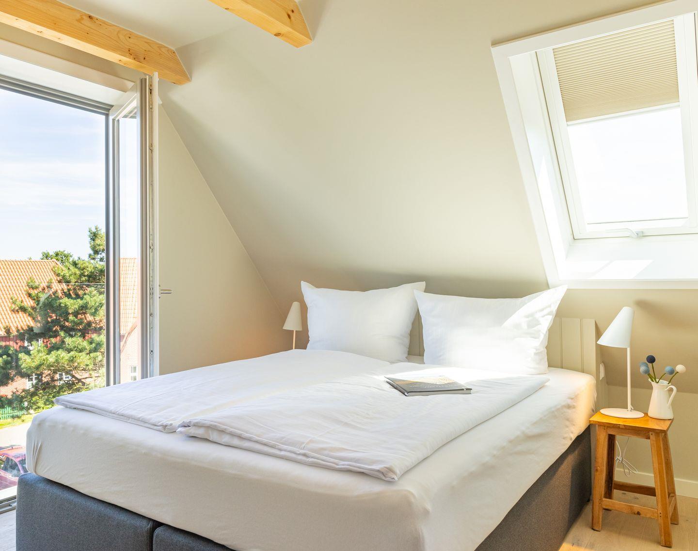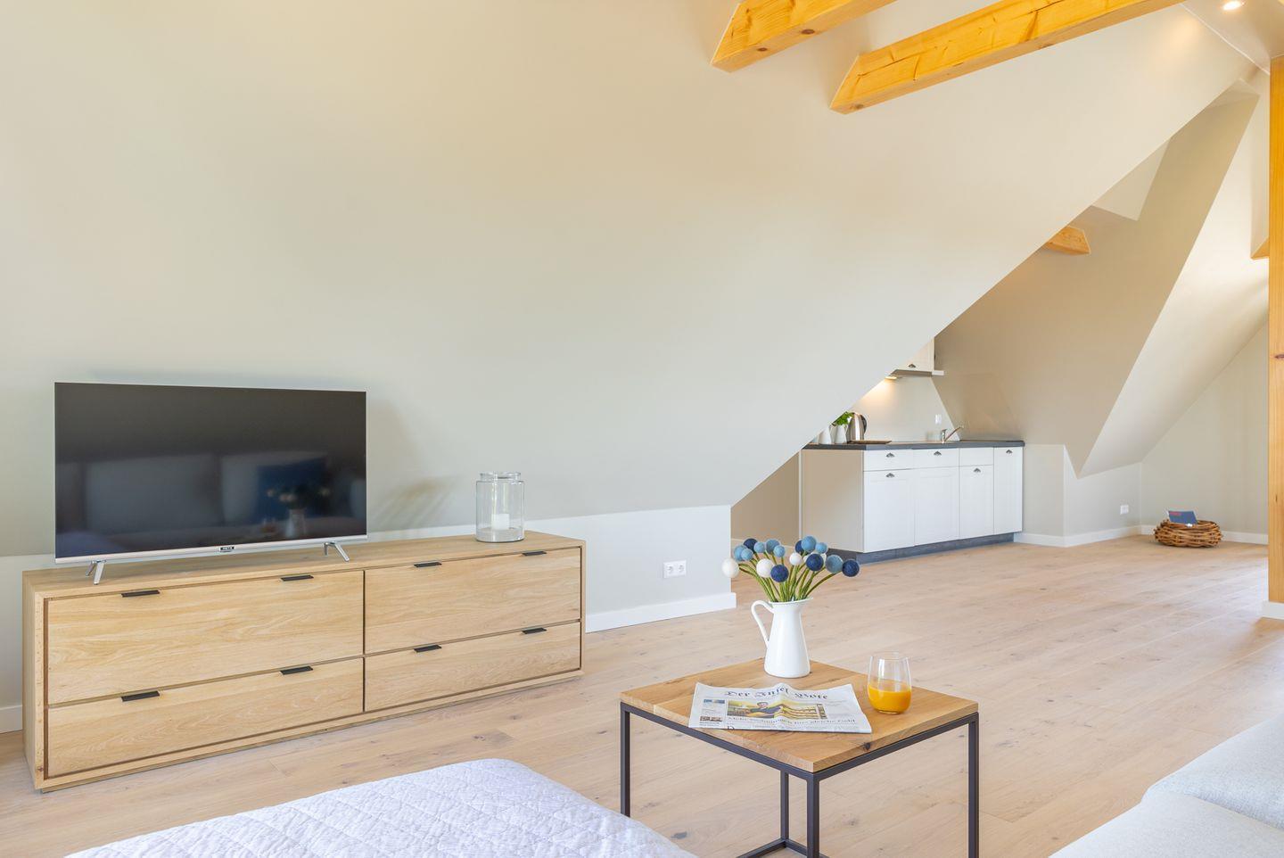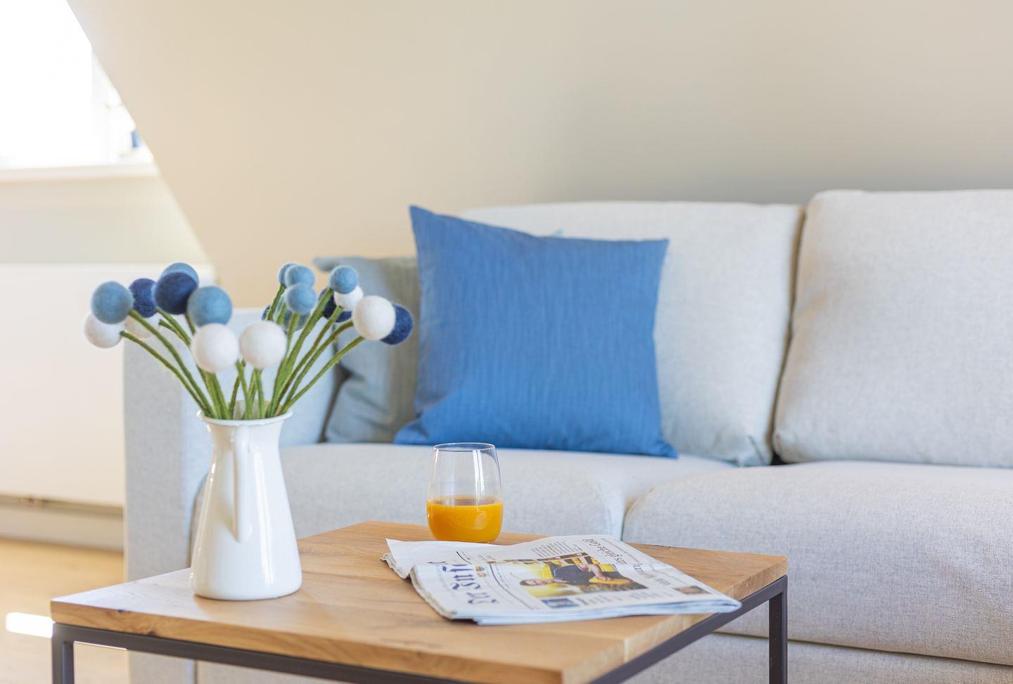 Diese 84qm² große Wohnung 1 liegt im zweiten Obergeschoß des Hauses. Sie ist hell und geschmackvoll eingerichtet und wird Ihnen vom ersten Tag an Erholung bieten. Diese elegant, im nordischen Stil gestaltete Ferienwohnung ist ein optimaler Ausgangspunkt für Ihre Aktivitäten. Sie ist mit ihren skandinavischen und hochwertigen Möbeln die Wohlfühloase Ihres Inselurlaubes. Hier erwartet Sie ein Schlafzimmer mit einem 1,60m großem Boxspringbett. Im Wohn- und Essbereich ist eine Küche integriert. Die Küche ist mit allen Utensilien ausgestattet. Der Wohnbereich mit TV, einem Ecksofa und zwei Sesseln lädt zu erholsamen Stunden ein.