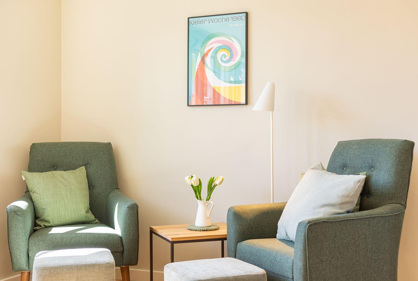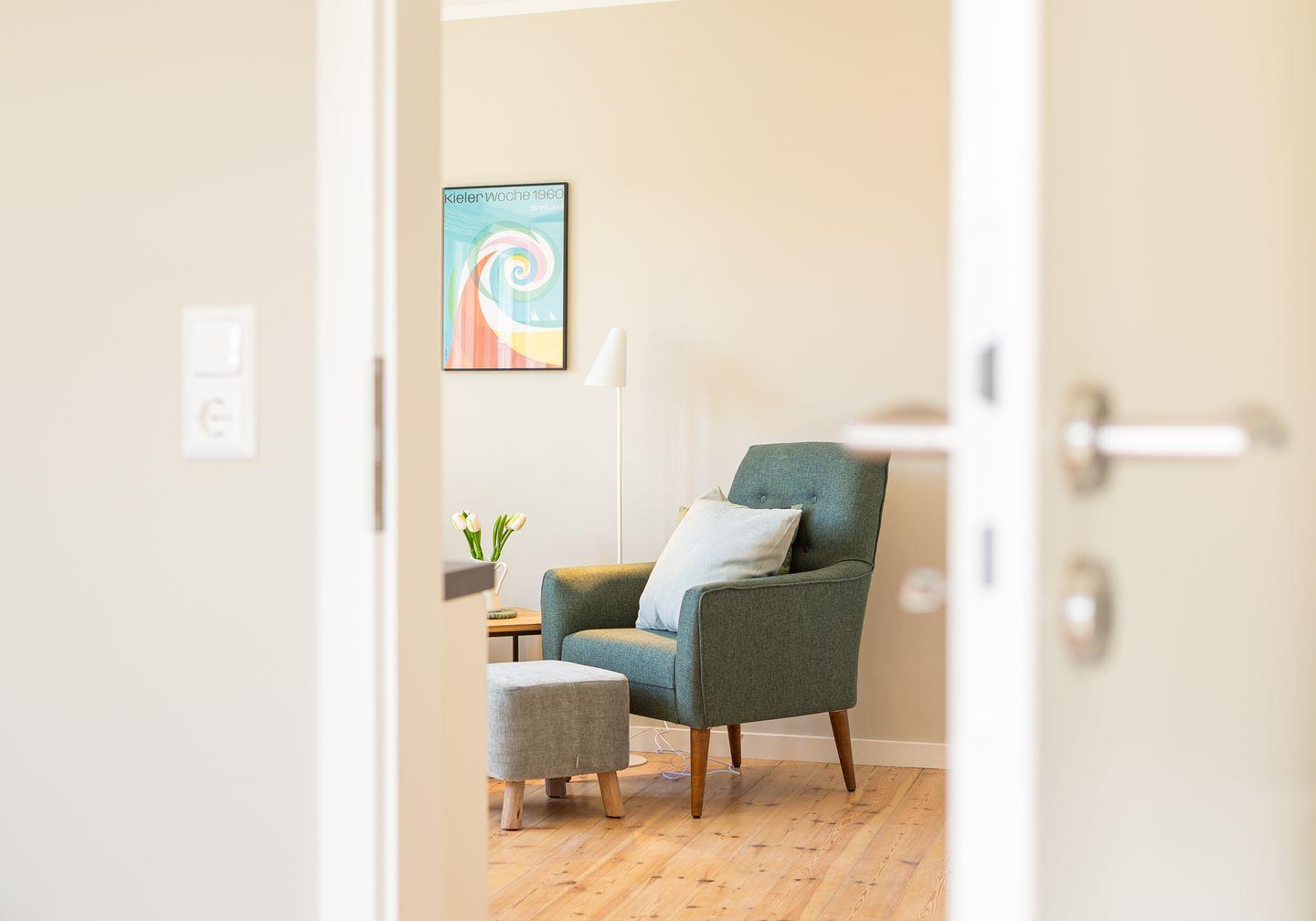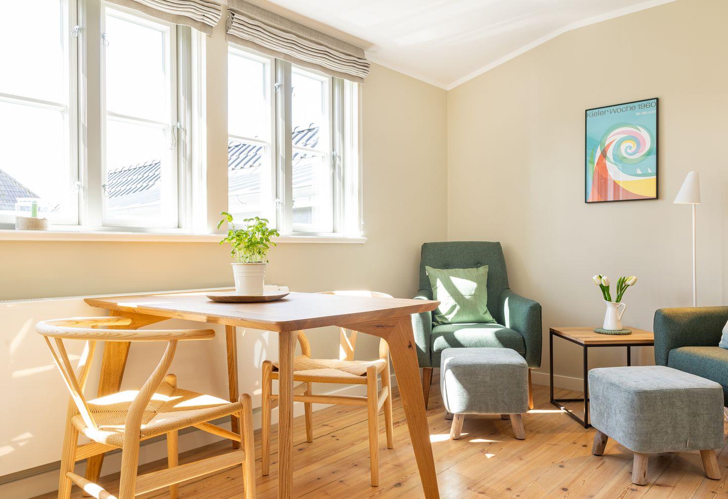 Moderne Wohnung im Herzen von Norddorf mit skandinavischem Stil und kostenfreiem Fitness-Studiozugang.