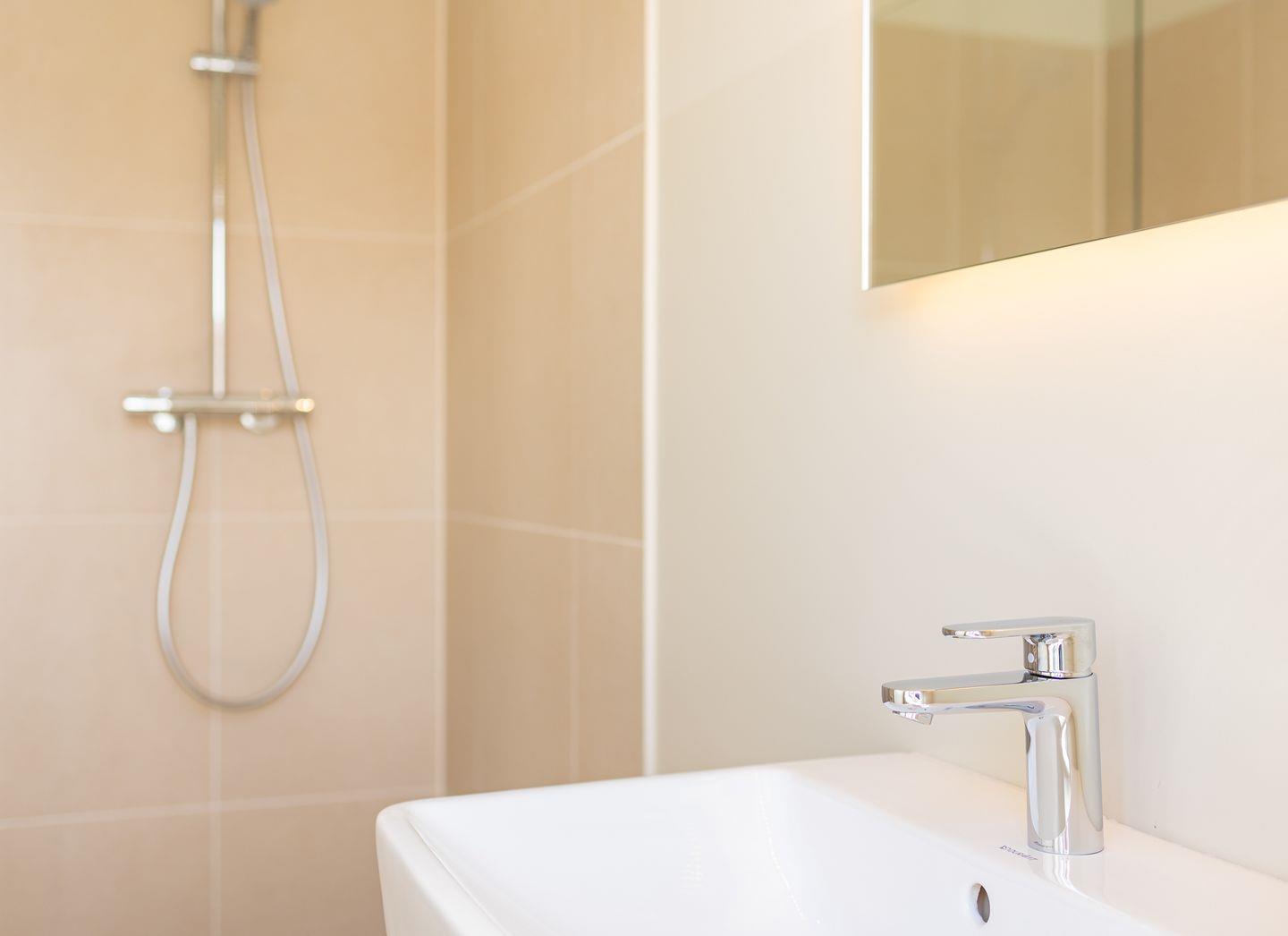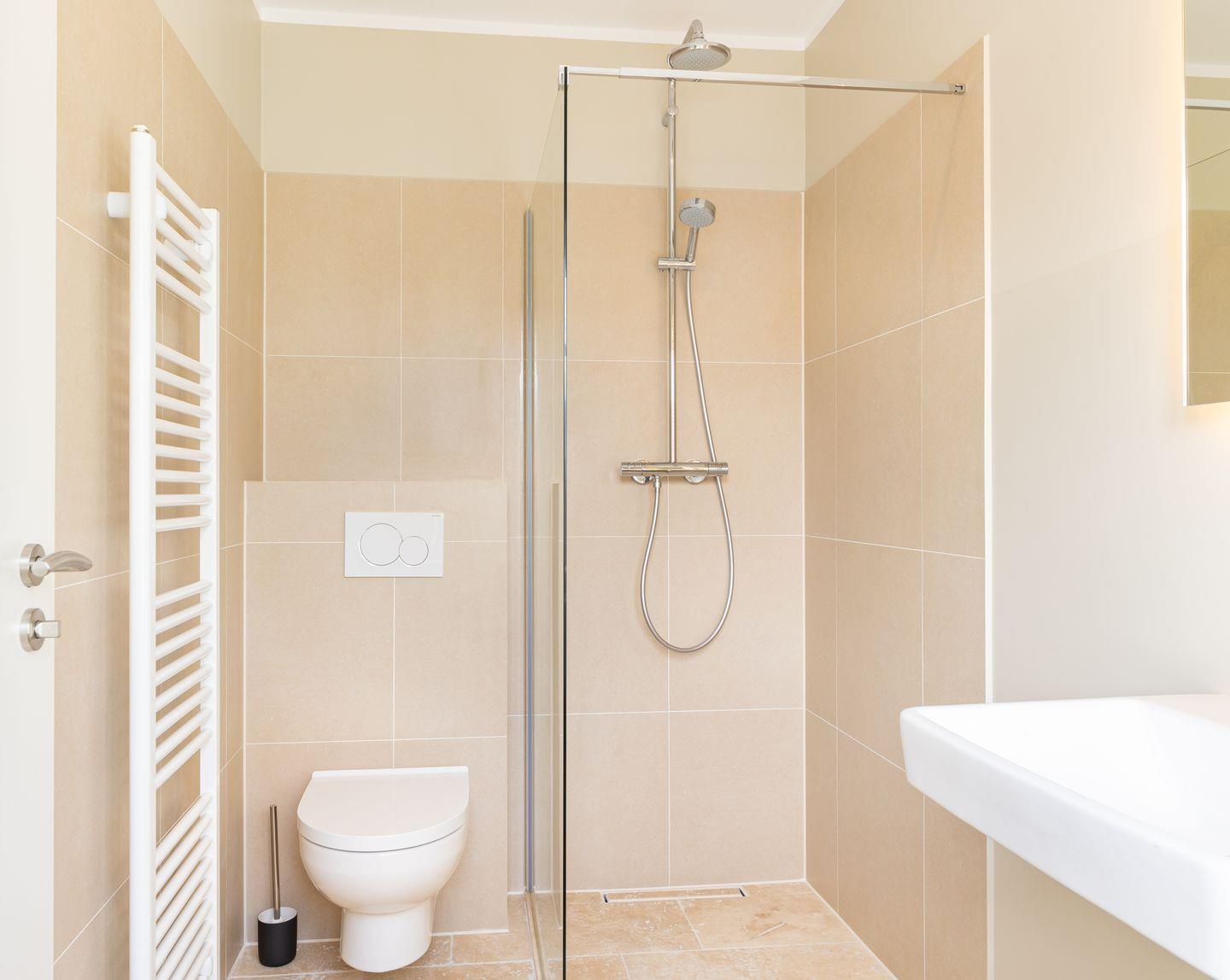 Das neue Bad ist mit hellem Naturstein gefliest. Die offene bodentiefe Regendusche ist begehbar und hat eine gläserne Seitenwand.