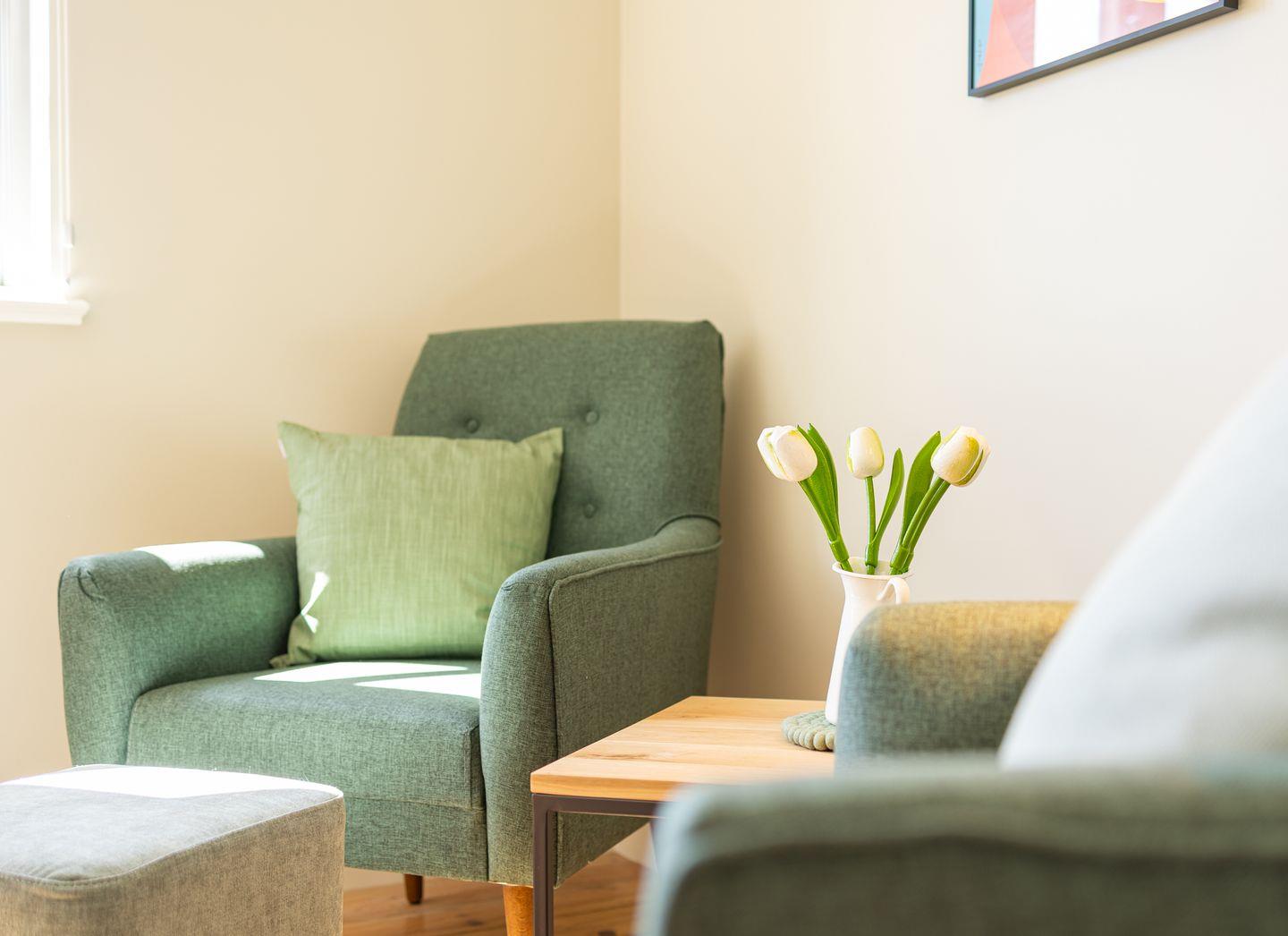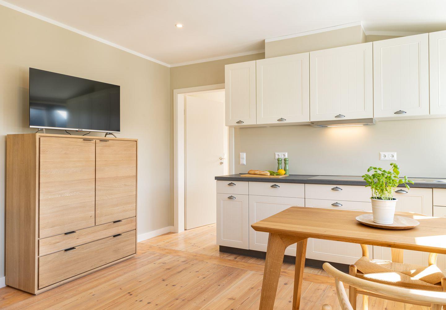 Diese 43qm² große Wohnung 2 liegt im ersten OG. Sie ist hell und geschmackvoll eingerichtet und bietet Ihnen vom ersten Tag an Erholung. Sie ist mit skandinavischen und hochwertigen Möbeln die Wohlfühloase Ihrer Amrumzeit. Im Wohn- und Essbereich ist eine Küche integriert. Der Wohnbereich mit TV und zwei Sesseln lädt zu erholsamen Stunden ein. Das Schlafzimmer ist mit einem 1,60 m breiten Boxspringbett ausgestattet.