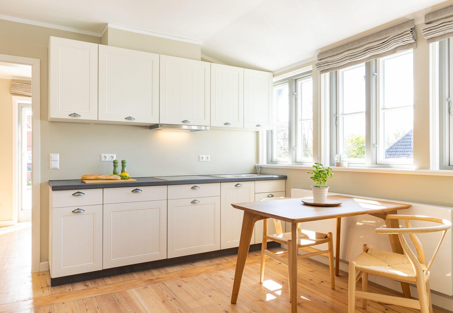 Diese 43qm² große Wohnung 2 liegt im ersten Obergeschoß des Hauses. Sie ist hell und geschmackvoll eingerichtet und wird Ihnen vom ersten Tag an Erholung bieten. Diese elegant, im nordischen Stil gestaltete Ferienwohnung ist ein optimaler Ausgangspunkt für Ihre Aktivitäten. Sie ist mit ihren skandinavischen und hochwertigen Möbeln die Wohlfühloase Ihrer Amrumzeit. Hier erwartet Sie ein Schlafzimmer mit einem 1,60m großem Boxspringbett. Im Wohn- und Essbereich ist eine Küche integriert. Die Küche ist mit allen Utensilien ausgestattet. Der Wohnbereich mit TV und zwei Sesseln lädt zu erholsamen Stunden ein.