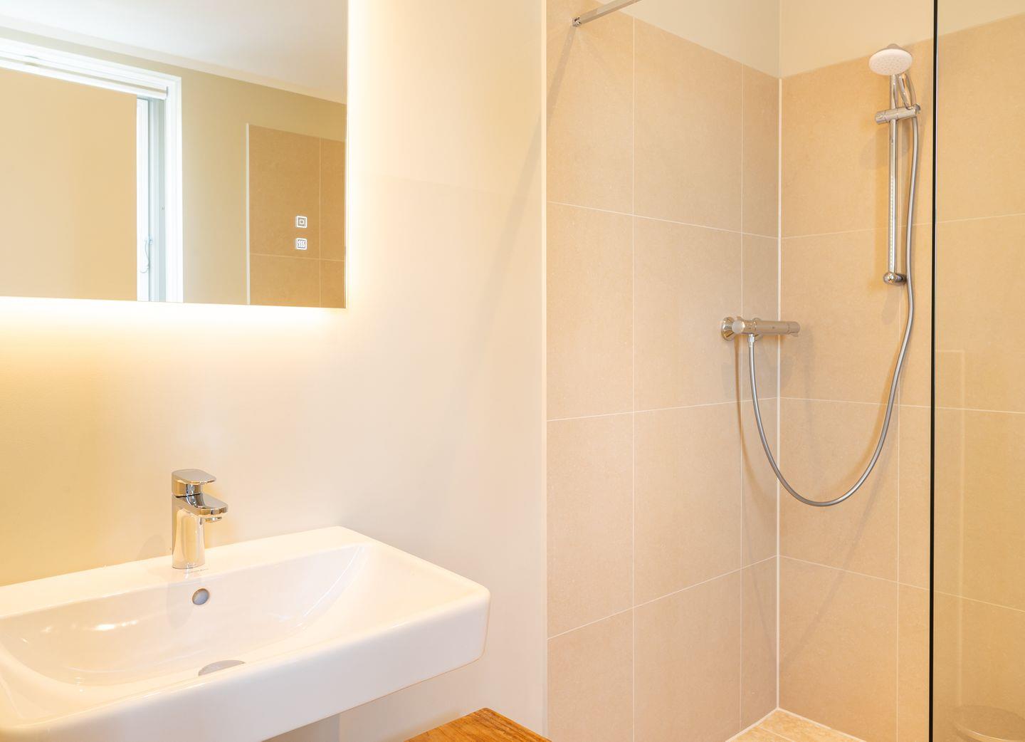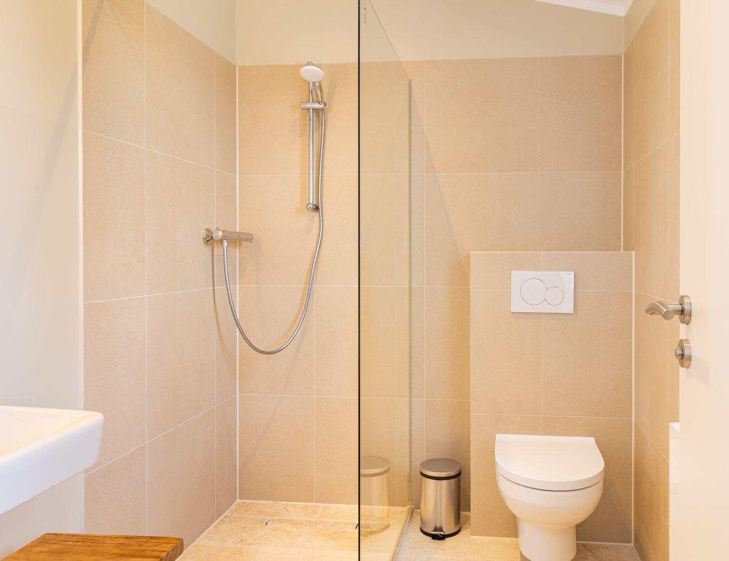 Das neue Bad ist mit hellem Naturstein gefliest. Die offene bodentiefe Dusche ist begehbar und hat eine gläserne Seitenwand.