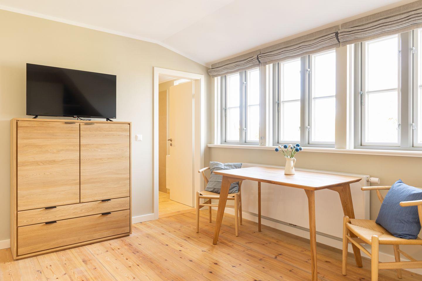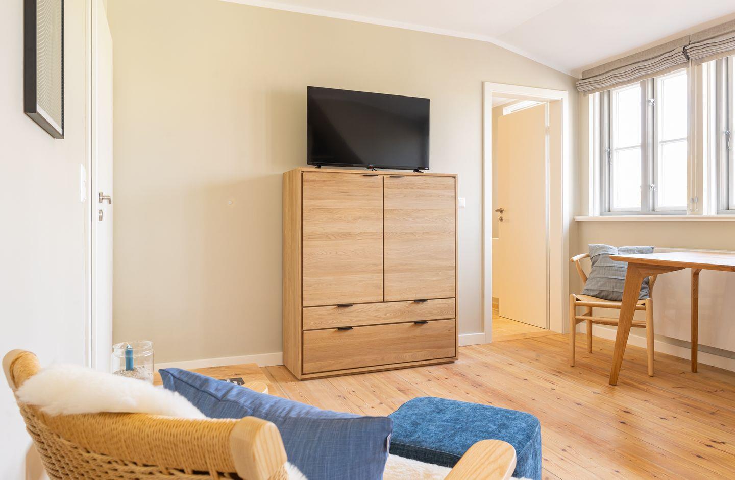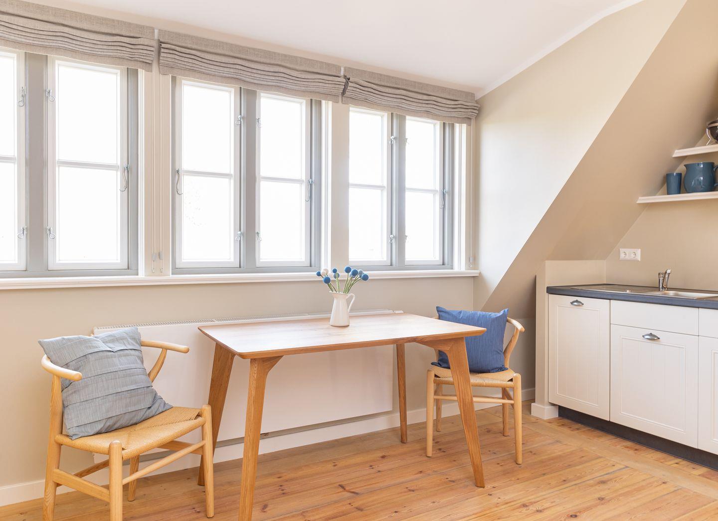 Diese 43qm² große Wohnung 3 liegt im ersten OG. Sie ist hell und geschmackvoll eingerichtet und bietet Ihnen vom ersten Tag an Erholung. Sie ist mit skandinavischen und hochwertigen Möbeln die Wohlfühloase Ihrer Amrumzeit. Im Wohn- und Essbereich ist eine Küche integriert. Der Wohnbereich mit TV und zwei Sesseln lädt zu erholsamen Stunden ein. Das Schlafzimmer ist mit einem 1,60 m breiten Boxspringbett ausgestattet.