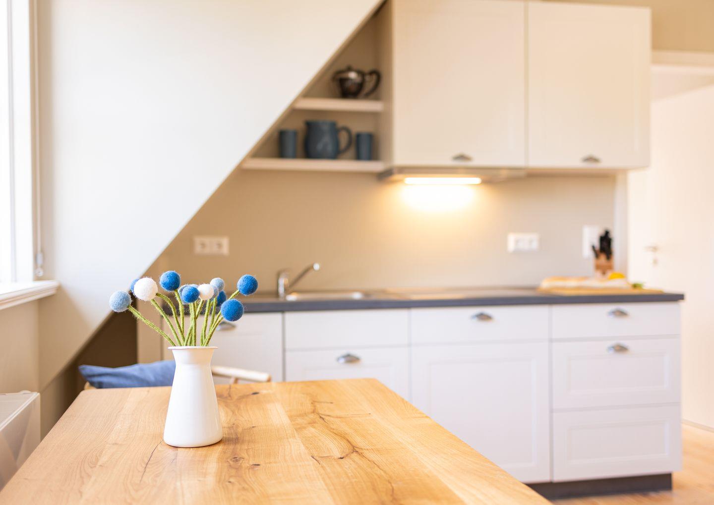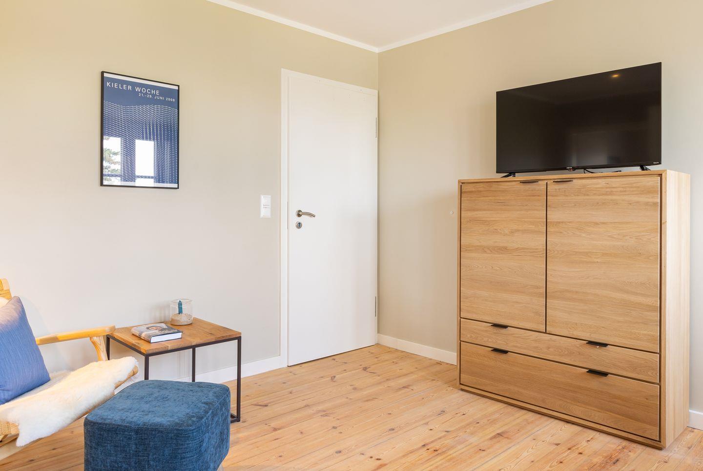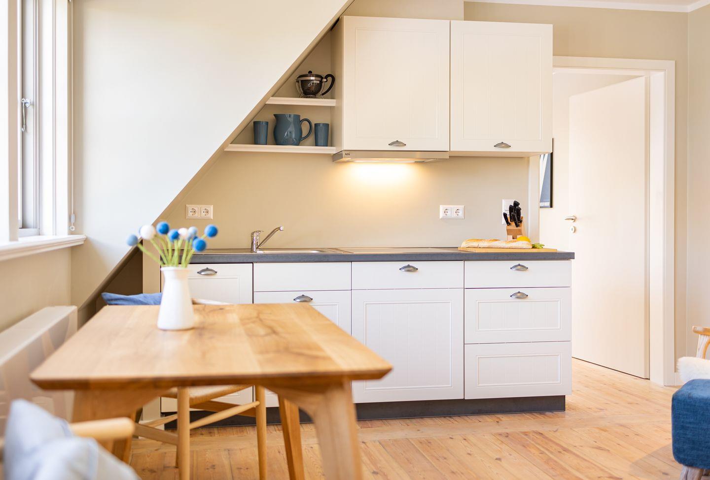 Diese 43qm² große Wohnung 3 liegt im ersten OG. Sie ist hell und geschmackvoll eingerichtet und bietet Ihnen vom ersten Tag an Erholung. Sie ist mit skandinavischen und hochwertigen Möbeln die Wohlfühloase Ihrer Amrumzeit. Im Wohn- und Essbereich ist eine Küche integriert. Der Wohnbereich mit TV und zwei Sesseln lädt zu erholsamen Stunden ein. Das Schlafzimmer ist mit einem 1,60 m breiten Boxspringbett ausgestattet.
