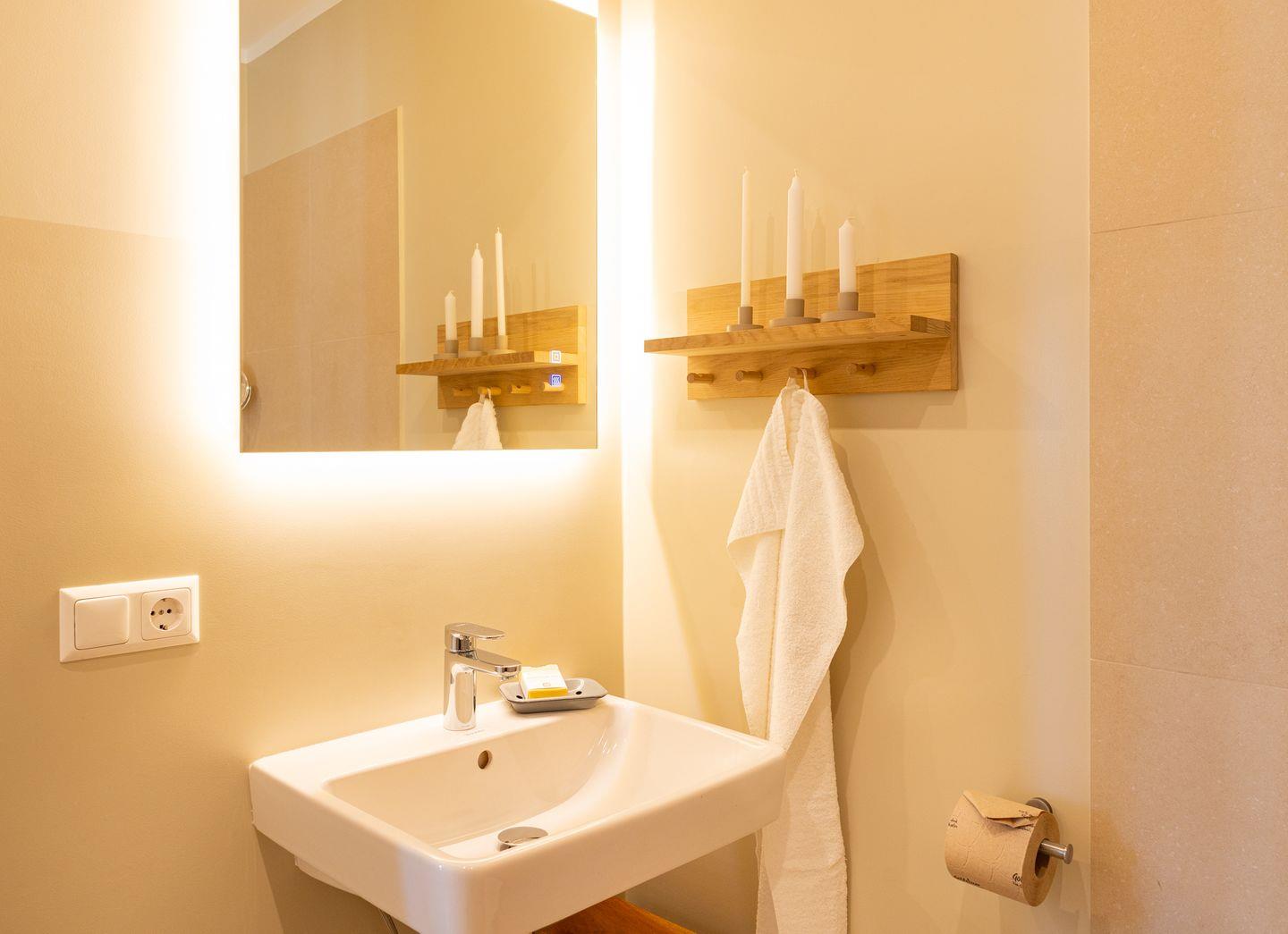 Das neue Bad ist mit hellem Naturstein gefliest. Die offene bodentiefe Regendusche ist begehbar und hat eine gläserne Seitenwand.