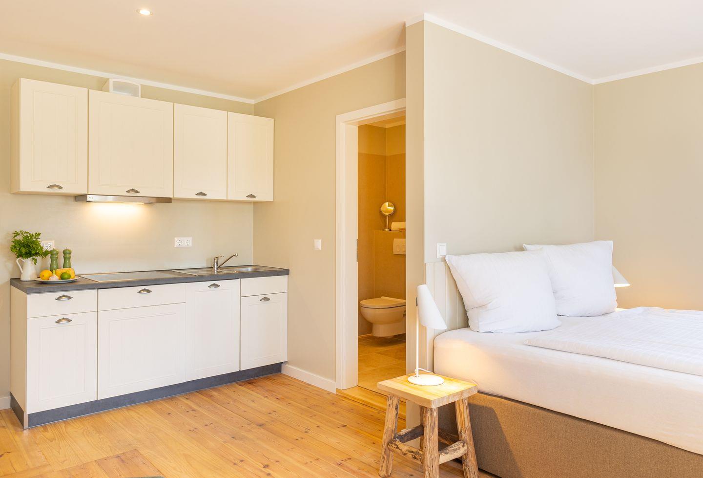 Diese 25qm² große Einraumwohnung 5 liegt im ersten OG. Sie ist hell und geschmackvoll eingerichtet und bietet Ihnen vom ersten Tag an Erholung. Sie ist mit skandinavischen und hochwertigen Möbeln die Wohlfühloase Ihrer Amrumzeit. Im Wohn- und Essbereich ist eine Küche integriert. Der Wohnbereich mit TV und einem Sessel sowie einem 1,60 m breiten Boxspringbett ausgestattet.