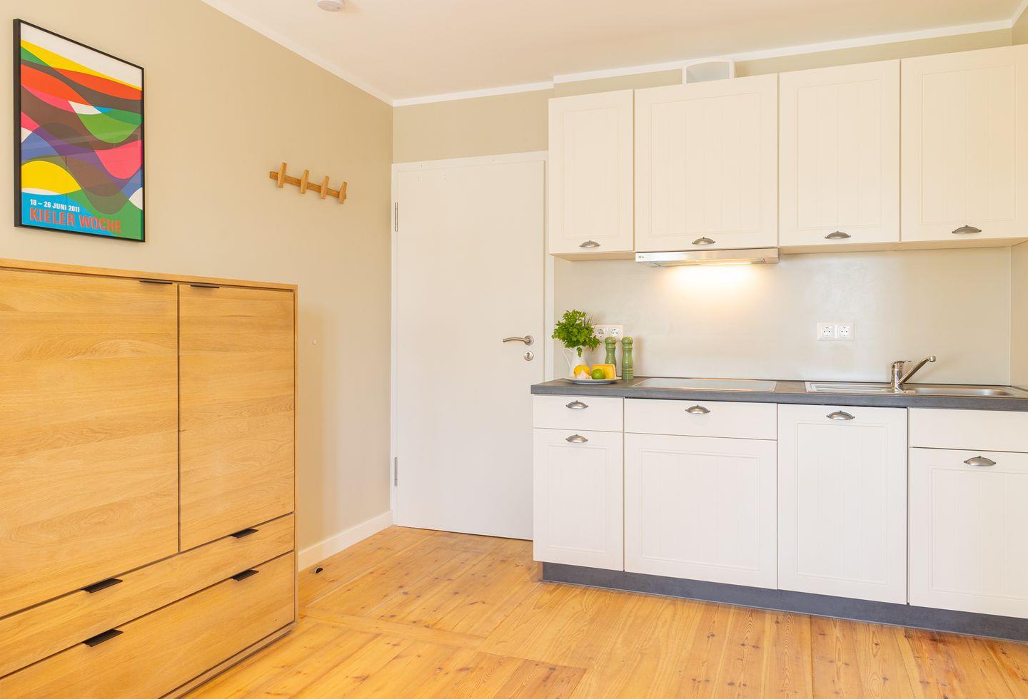 Diese 25 qm² große Einraum-Wohnung 5 liegt im ersten Obergeschoß des Hauses. Sie ist hell und geschmackvoll eingerichtet und wird Ihnen vom ersten Tag an Erholung bieten. Diese elegant, im nordischen Stil gestaltete Ferienwohnung ist ein optimaler Ausgangspunkt für Ihre Aktivitäten. Sie ist mit ihren skandinavischen und hochwertigen Möbeln die Wohlfühloase Ihrer Amrumzeit. Hier erwartet Sie ein Wohnraum mit einem 1,60m großem Boxspringbett und dem Wohn- und Essbereich. Die Küchenzeile befindet sich ebenfalls im Wohnraum. Die Küche ist mit allen Utensilien ausgestattet. Der Wohnbereich mit TV und einem Sessel lädt zu erholsamen Stunden ein.