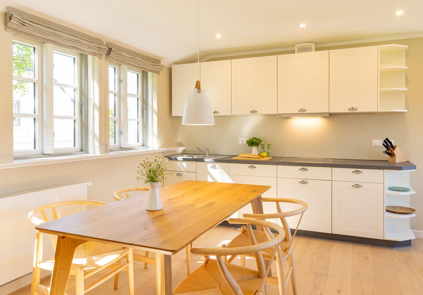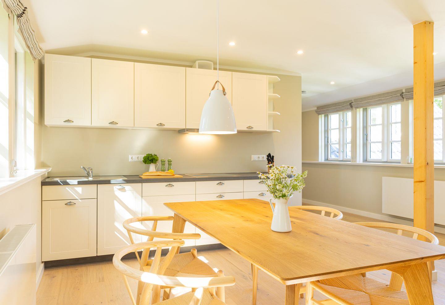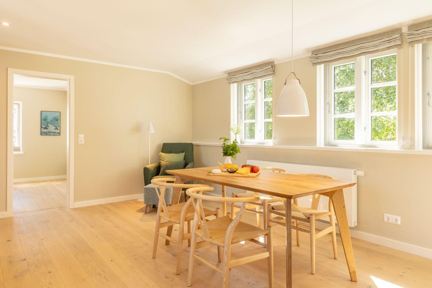 Diese 59 qm² große Wohnung 6 liegt im ersten Obergeschoß des Hauses. Sie ist hell und geschmackvoll eingerichtet und wird Ihnen vom ersten Tag an Erholung bieten. Diese elegant, im nordischen Stil gestaltete Ferienwohnung ist ein optimaler Ausgangspunkt für Ihre Aktivitäten. Sie ist mit ihren skandinavischen und hochwertigen Möbeln die Wohlfühloase Ihrer Amrumzeit. Hier erwartet sie ein Schlafzimmer mit einem 1,80 m großem Boxspringbett. Im Wohn- und Essbereich ist eine Küche integriert. Die Küche ist mit allen Utensilien ausgestattet. Der Wohnbereich mit TV, Sofa und zwei Sesseln lädt zu erholsamen Stunden ein.