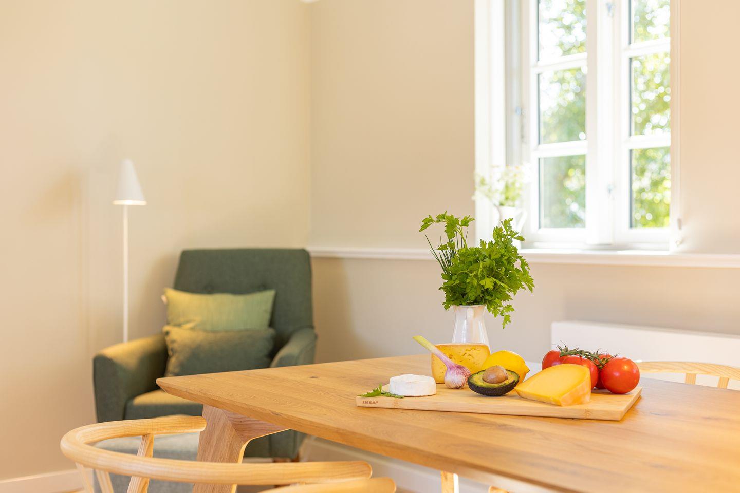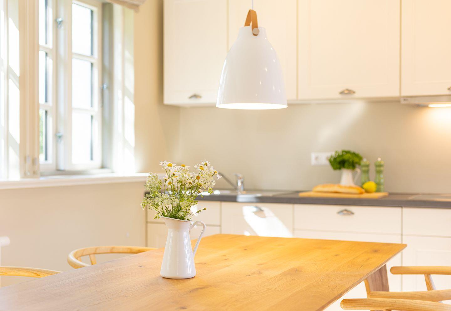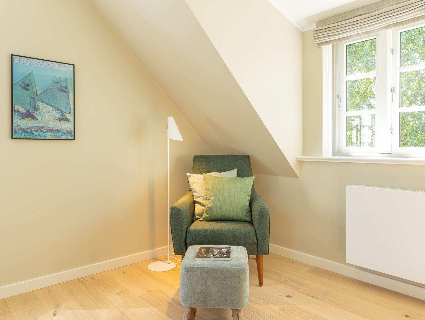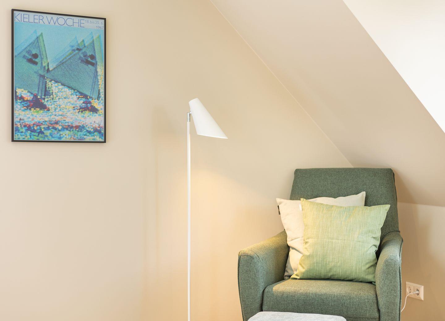 Diese 59 qm² große Wohnung 6 liegt im ersten Obergeschoß des Hauses. Sie ist hell und geschmackvoll eingerichtet und wird Ihnen vom ersten Tag an Erholung bieten. Diese elegant, im nordischen Stil gestaltete Ferienwohnung ist ein optimaler Ausgangspunkt für Ihre Aktivitäten. Sie ist mit ihren skandinavischen und hochwertigen Möbeln die Wohlfühloase Ihrer Amrumzeit. Hier erwartet sie ein Schlafzimmer mit einem 1,80 m großem Boxspringbett. Im Wohn- und Essbereich ist eine Küche integriert. Die Küche ist mit allen Utensilien ausgestattet. Der Wohnbereich mit TV, Sofa und zwei Sesseln lädt zu erholsamen Stunden ein.
