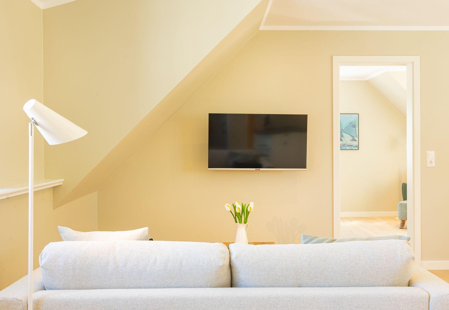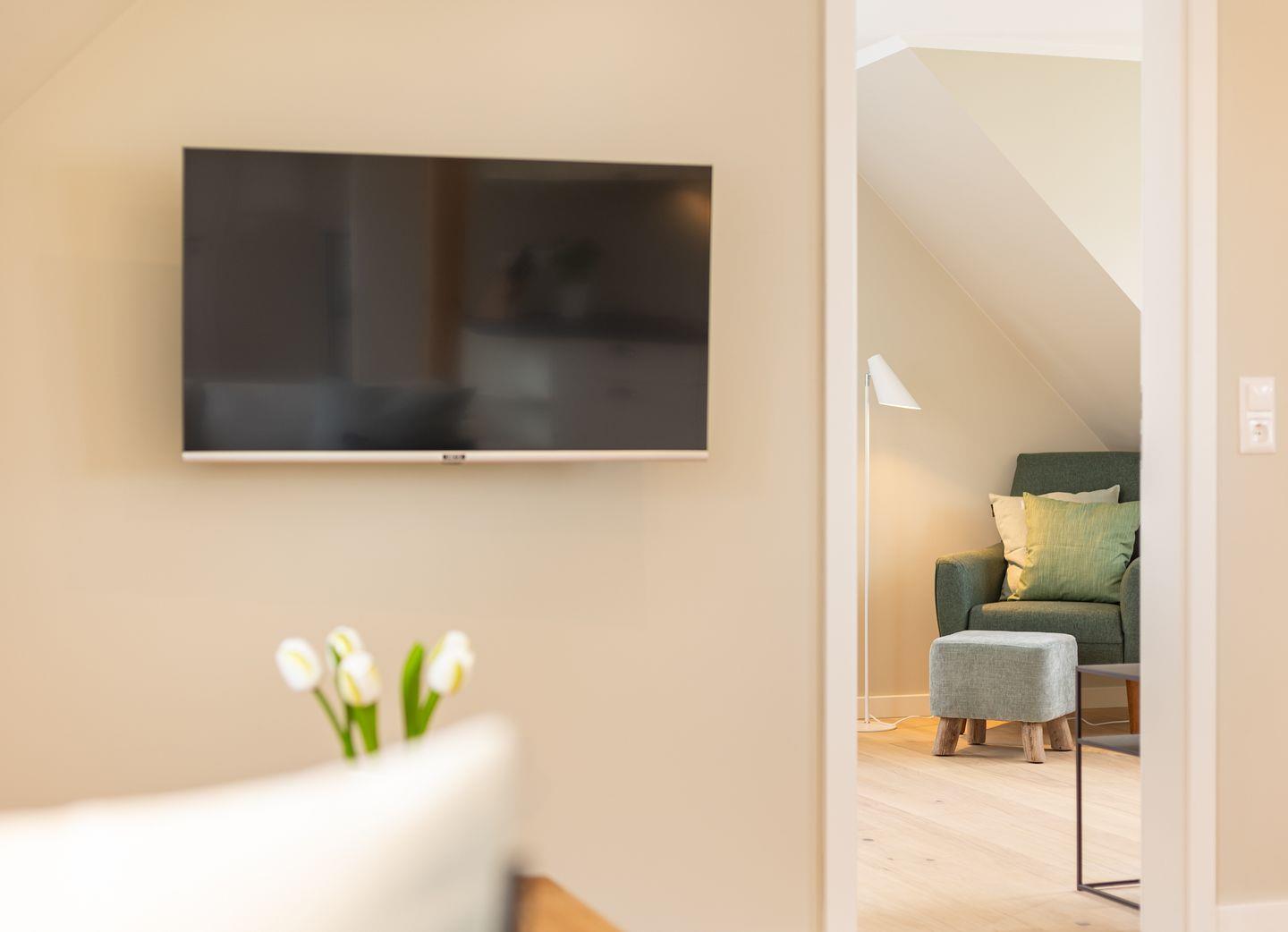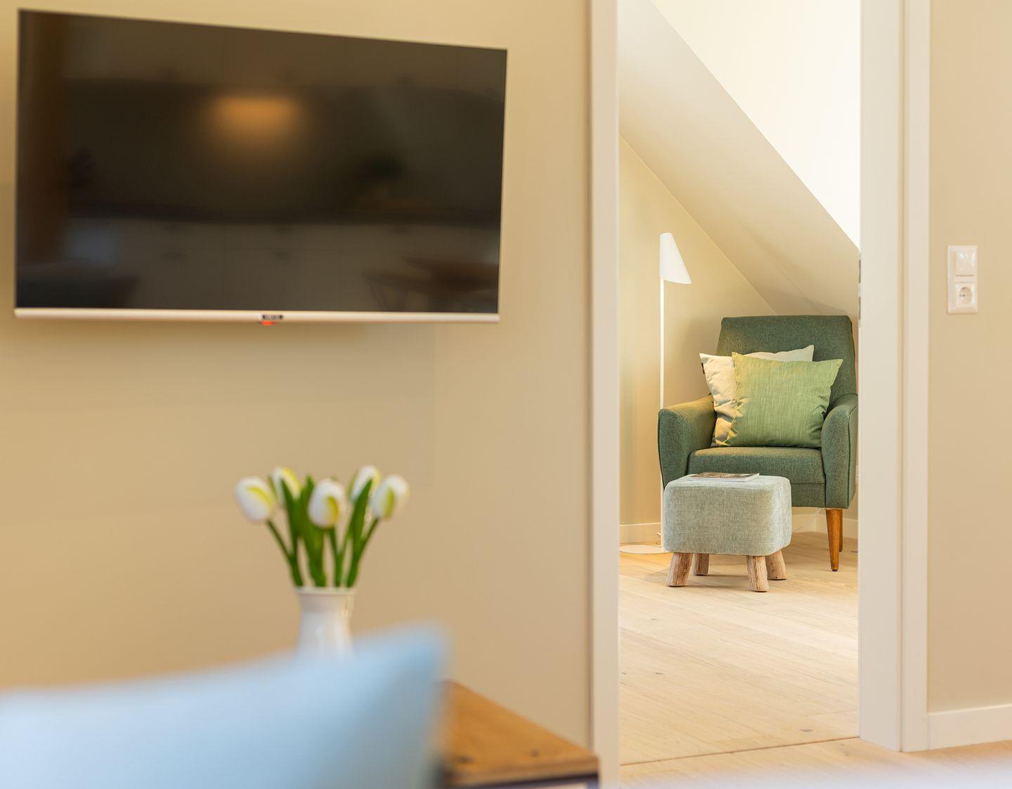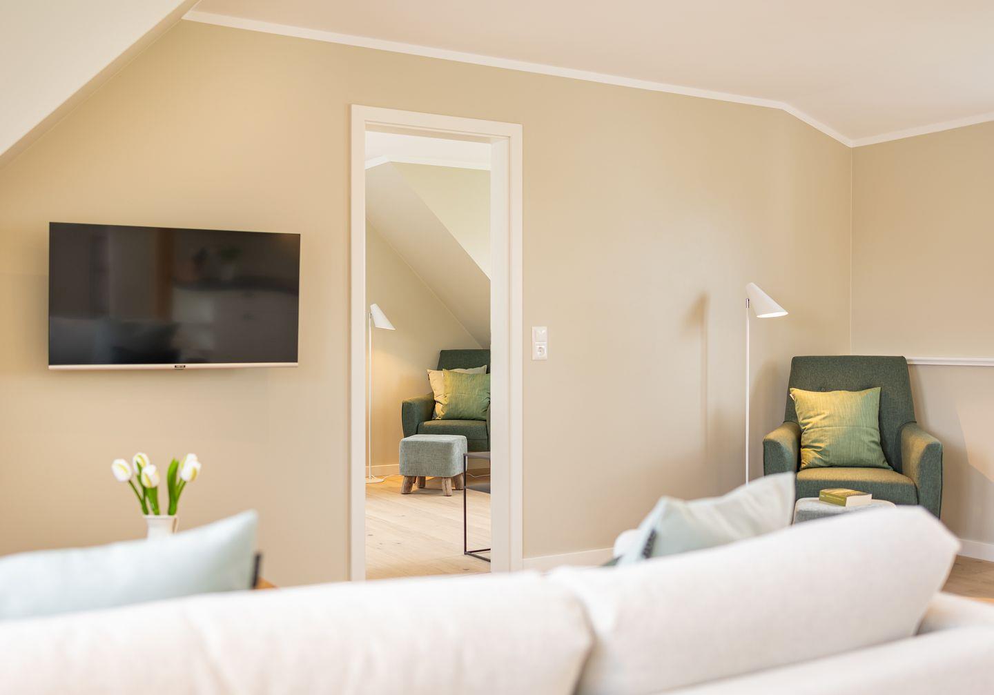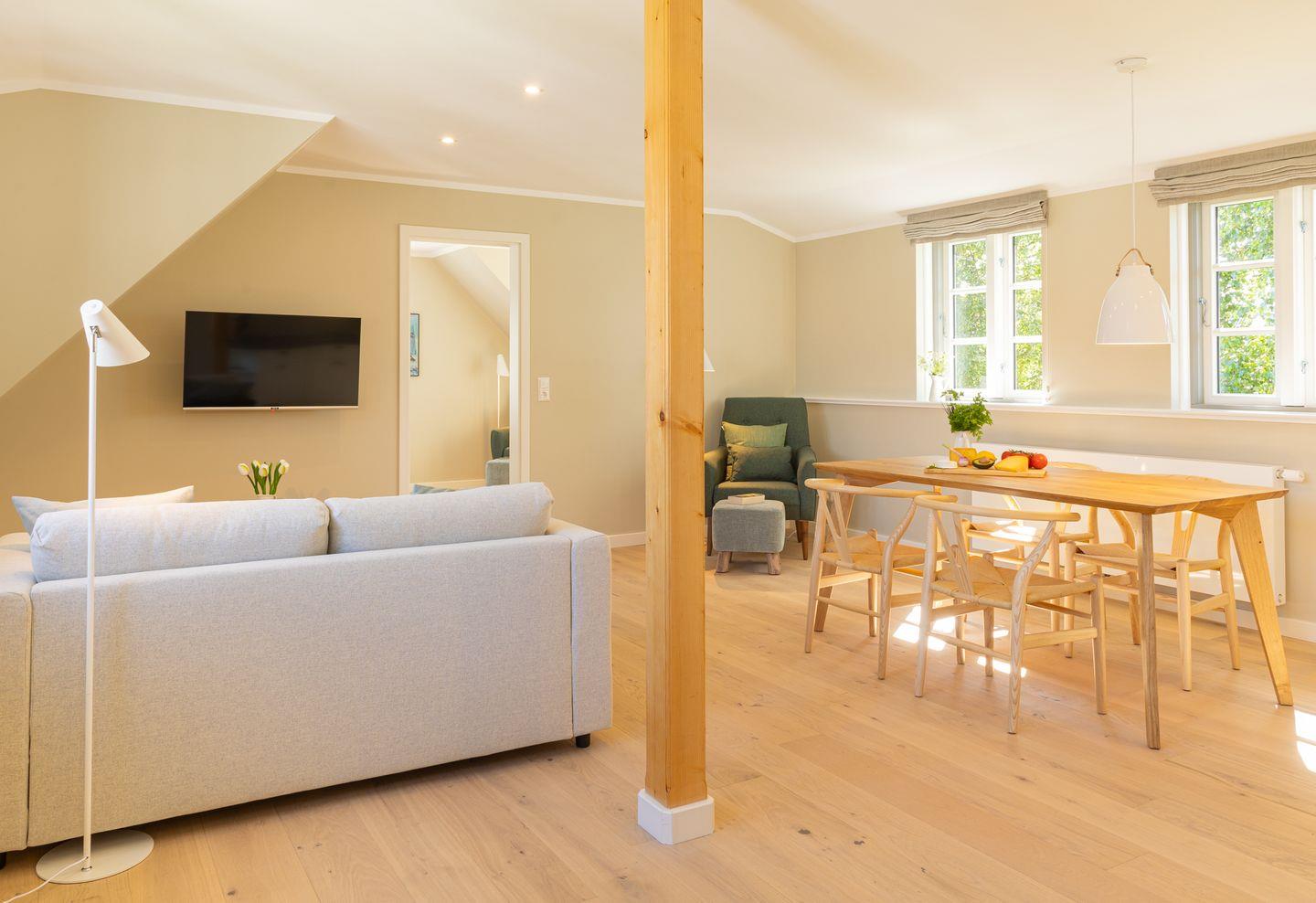 Diese 59 qm² große Wohnung 6 liegt im ersten OG. Sie ist hell und geschmackvoll eingerichtet und bietet vom ersten Tag an Erholung. Sie ist mit skandinavischen und hochwertigen Möbeln die Wohlfühloase Ihrer Amrumzeit. Im Wohn- und Essbereich ist eine Küche integriert. Der Wohnbereich mit TV, Sofa und zwei Sesseln lädt zu erholsamen Stunden ein. Das Schlafzimmer ist mit einem 1,80 m breiten Boxspringbett ausgestattet.