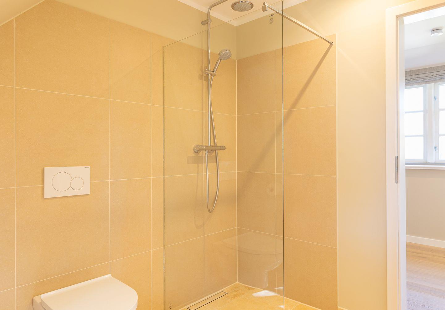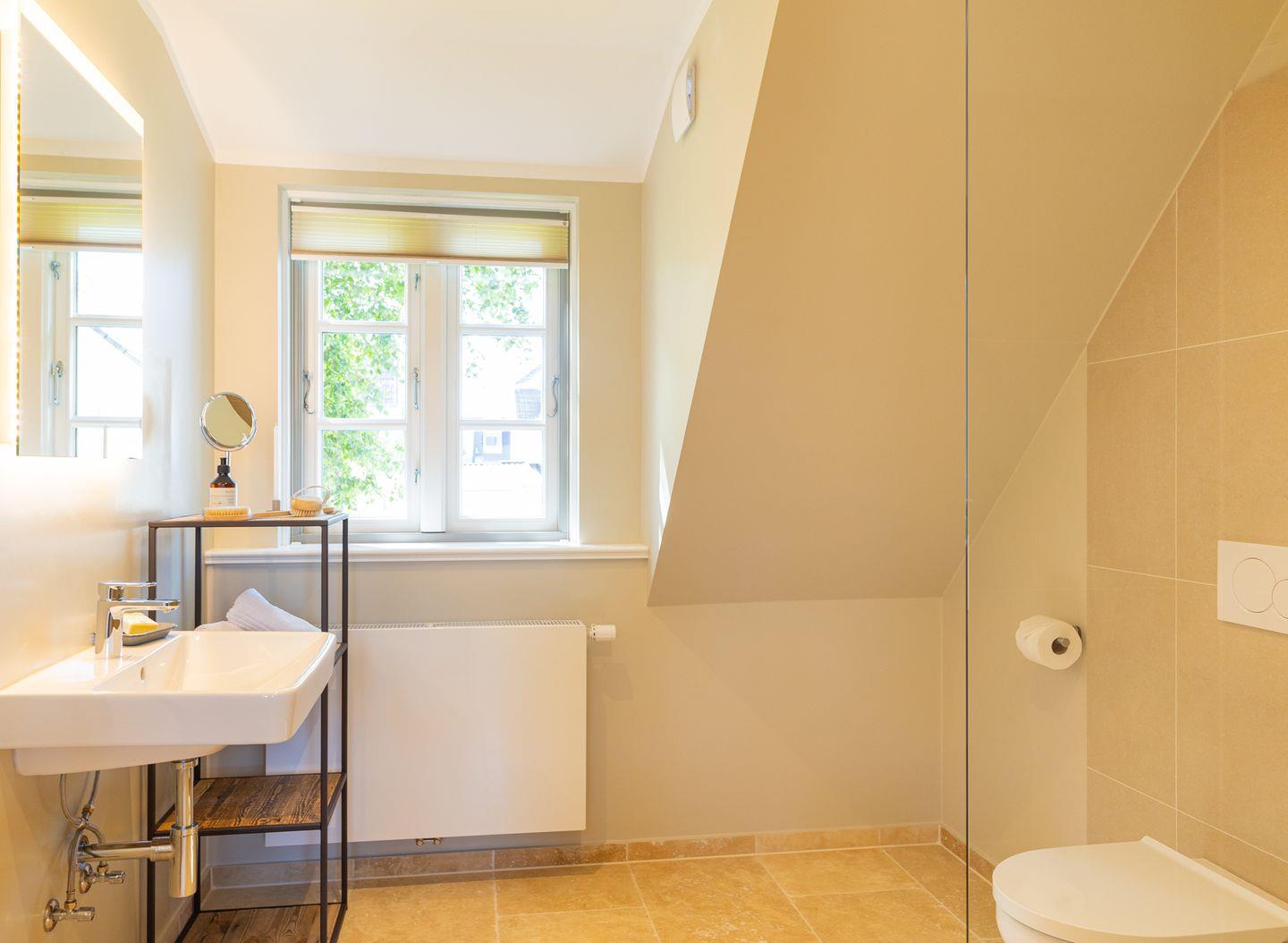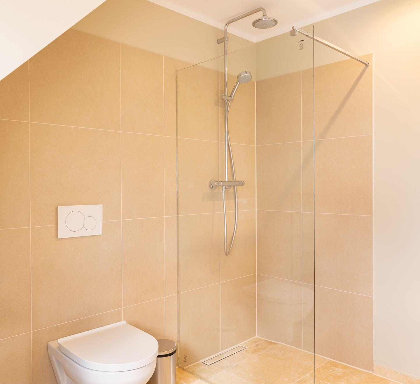 Das neue Bad ist mit hellem Naturstein gefliest. Die offene bodentiefe Regendusche ist begehbar und hat eine gläserne Seitenwand.